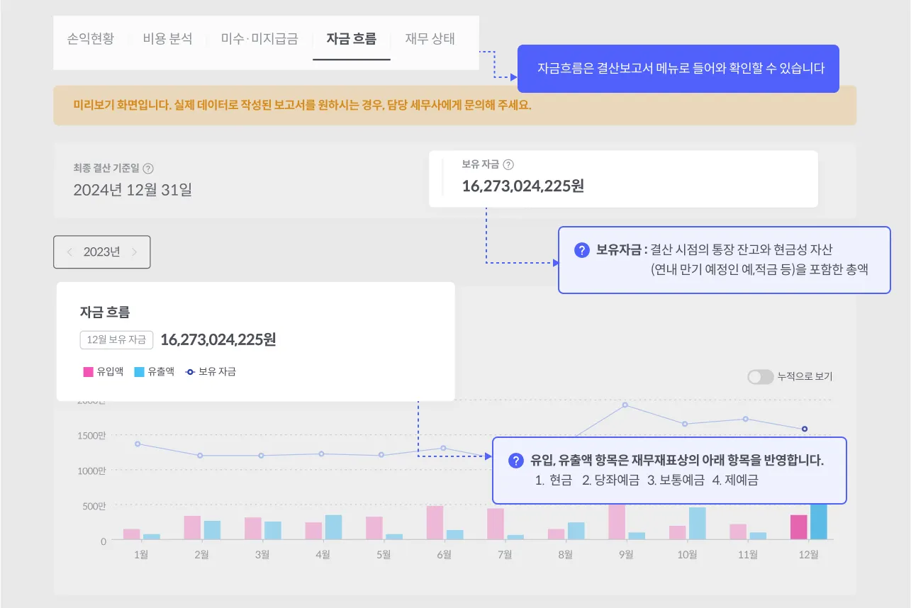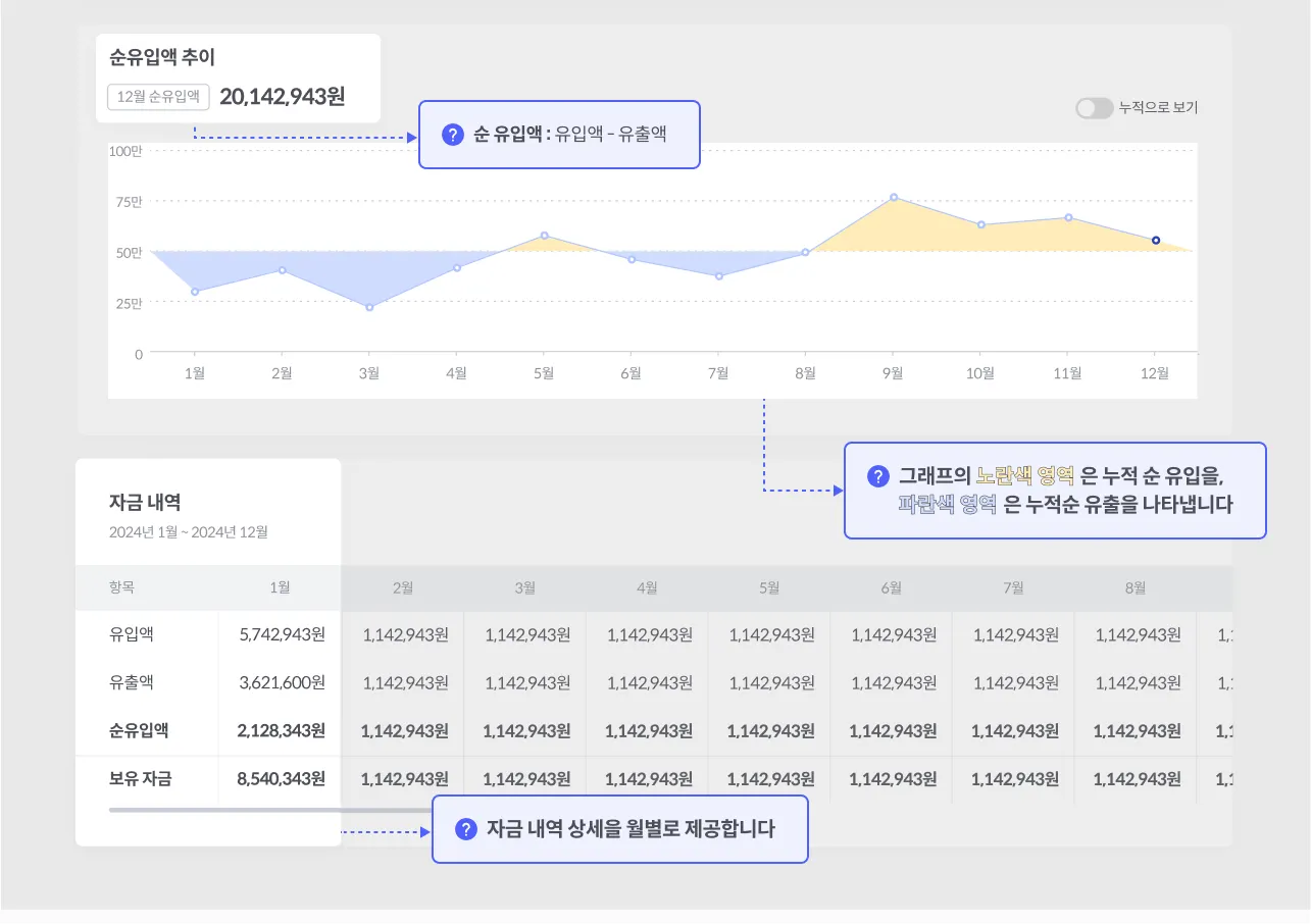 자금흐름 : 유입, 유출된 금액과 해당 월의 최종 보유자금을 연 단위 차트로 확인할 수 있습니다.