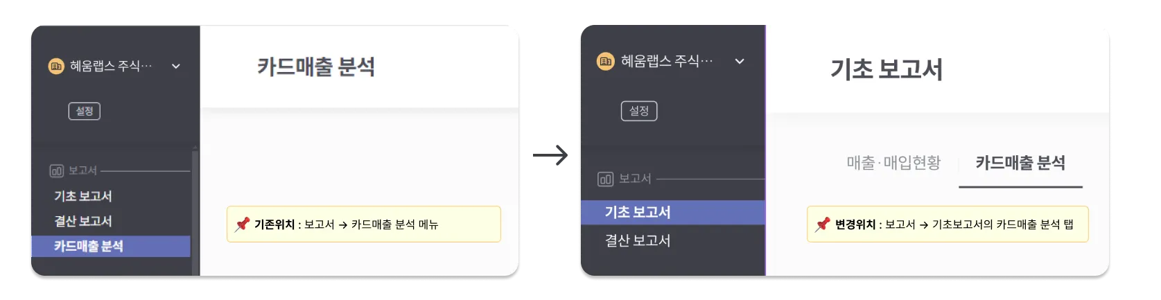 - 변경위치 : [보고서 > 기초 보고서 > 카드매출 분석] 탭