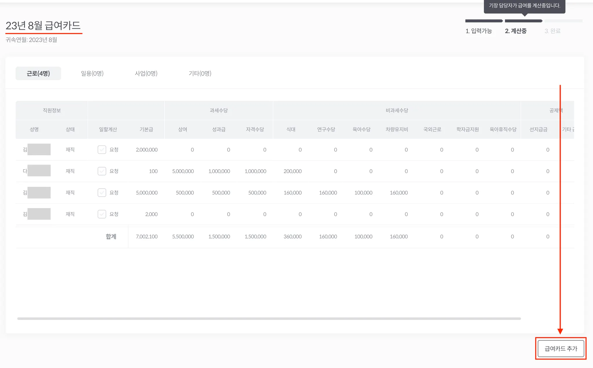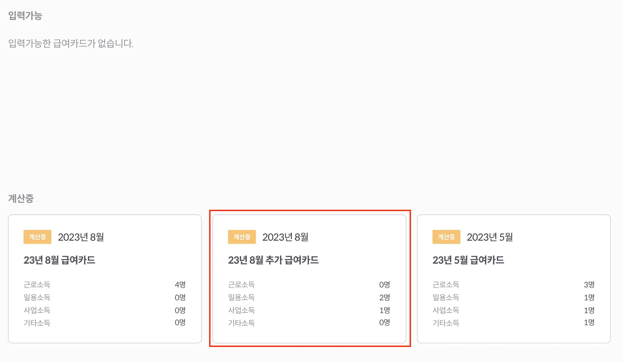 1. 추가 급여 대상이 속하는 동일한 귀속월 카드를 선택합니다. (계산중 혹은 완료 카드 중에 선택)