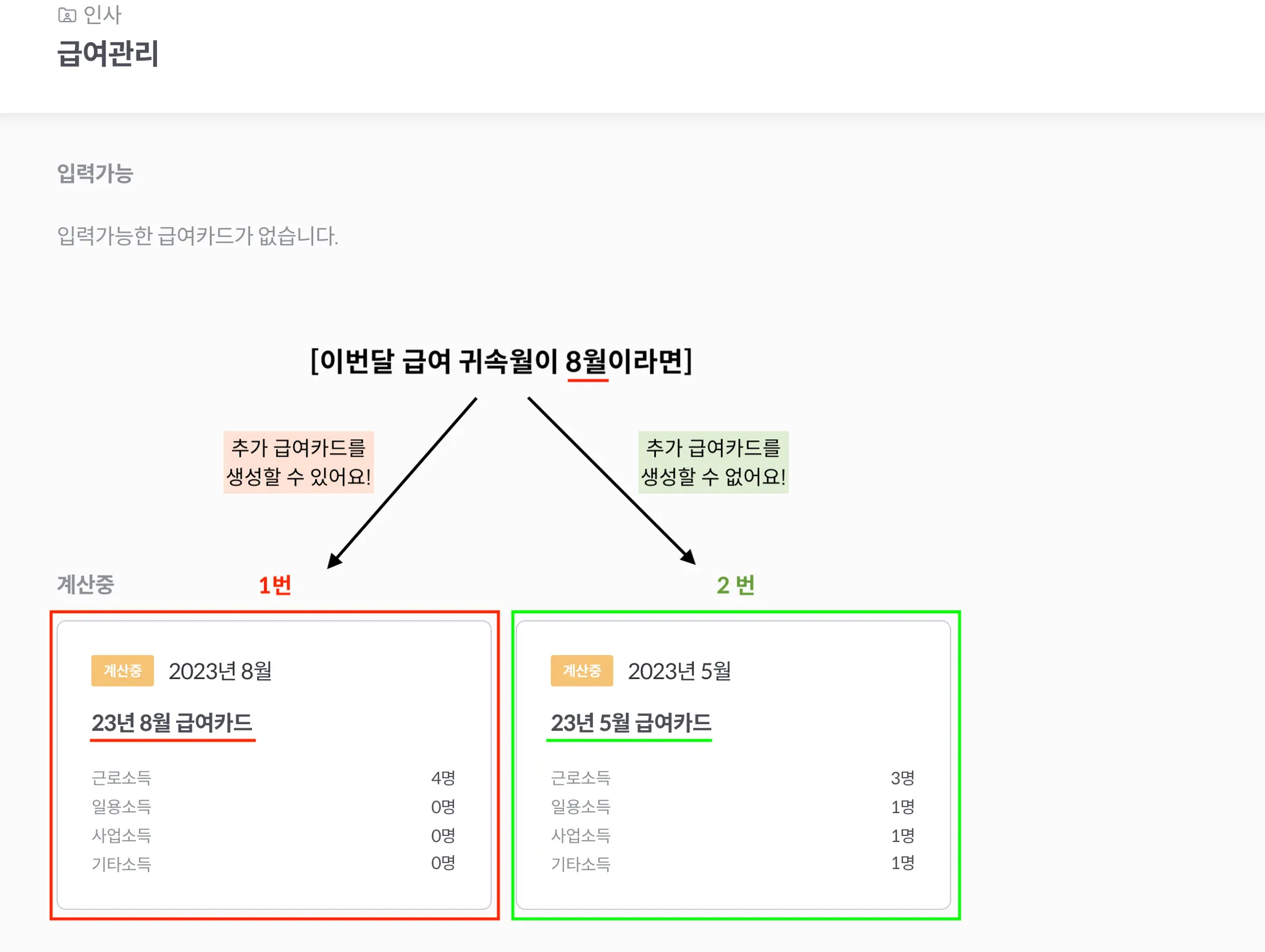 예시로 8월 XX일에 1번 카드에 들어가면 추가 급여카드 생성 버튼이 노출되고. 2번 카드에 들어갈 시 노출되지 않습니다.