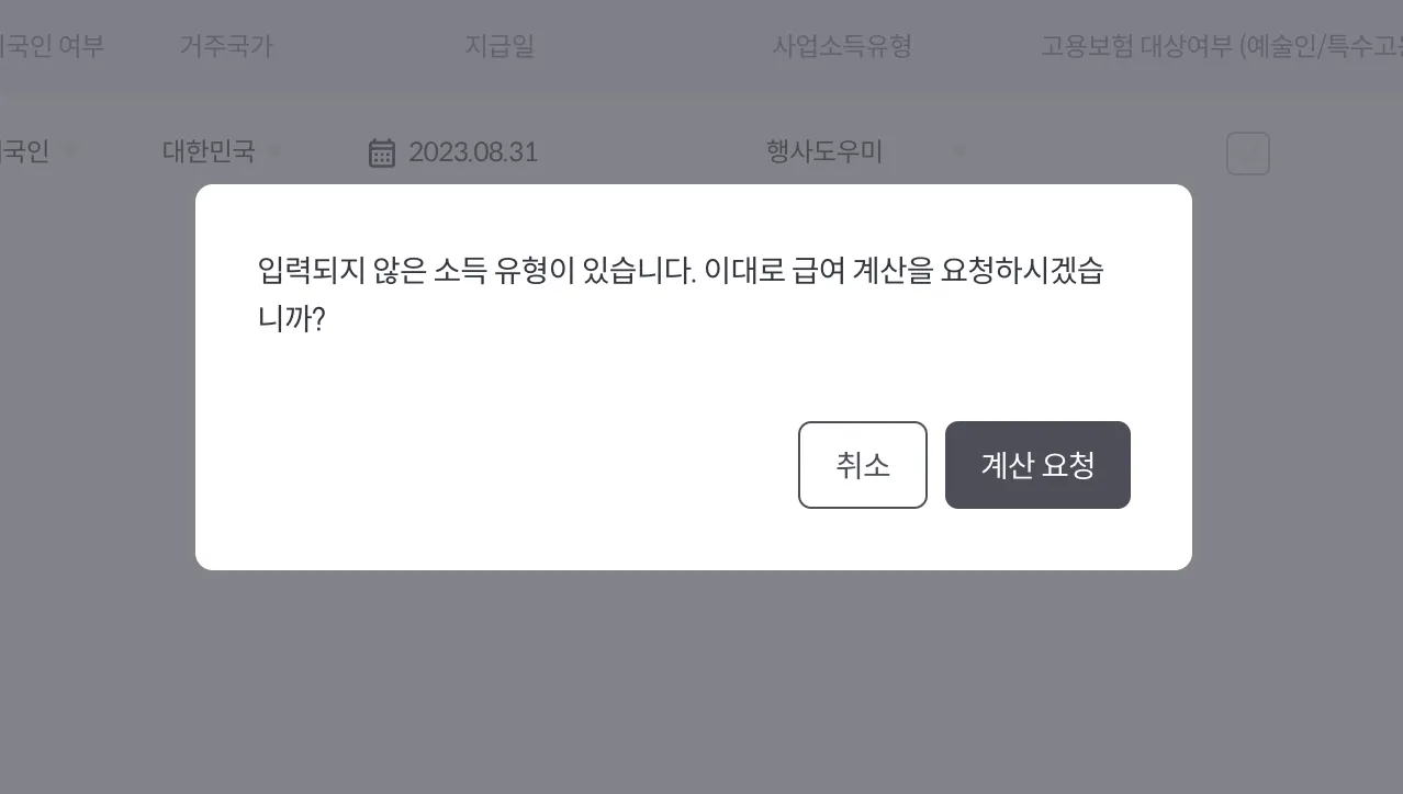 입력 항목이 없는 소득 유형이 있을시 노출되는 팝업.