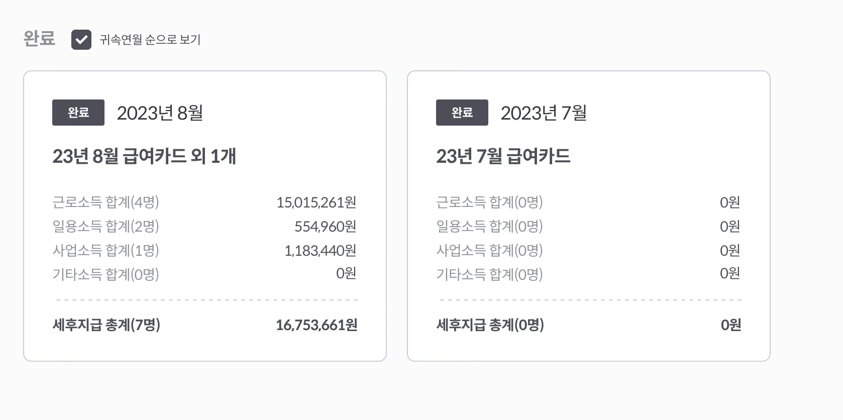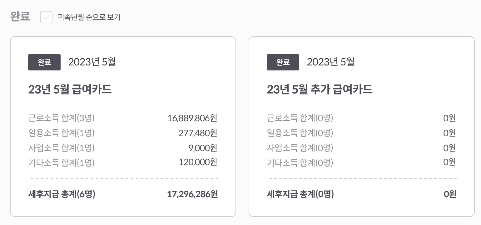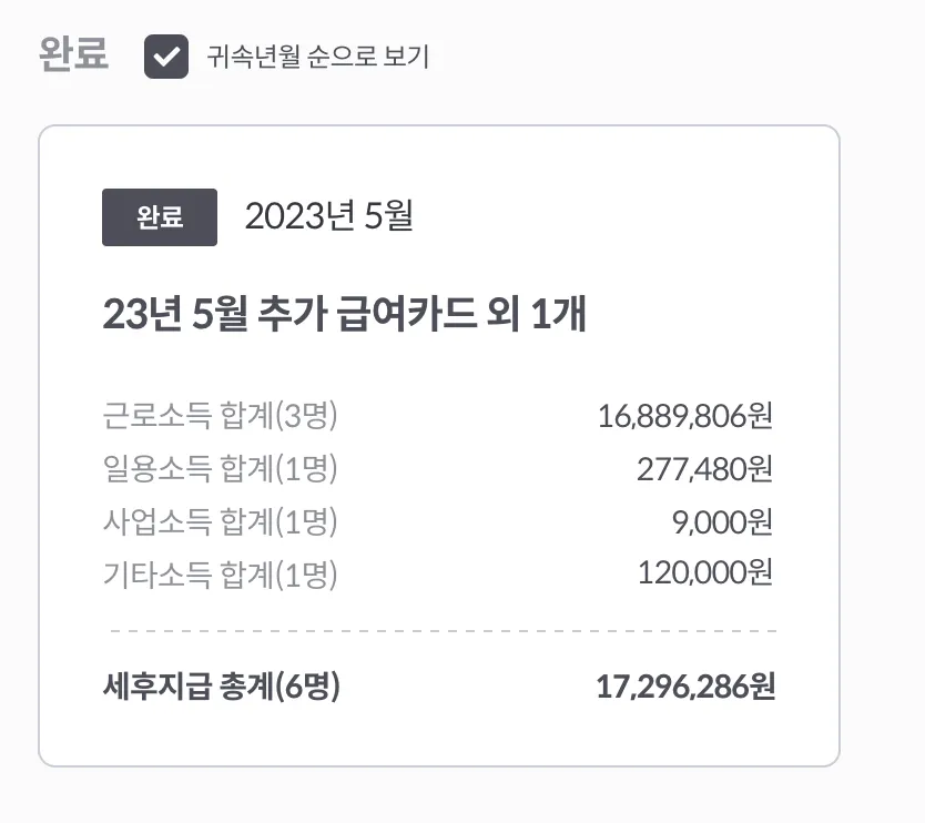 완료 상태의 카드에서 볼 수 있습니다. 동일한 귀속월에 속한 경우 묶여져서 보입니다.(귀속년월 순으로 보기가 체크해제 시 별도로 노출됩니다.)