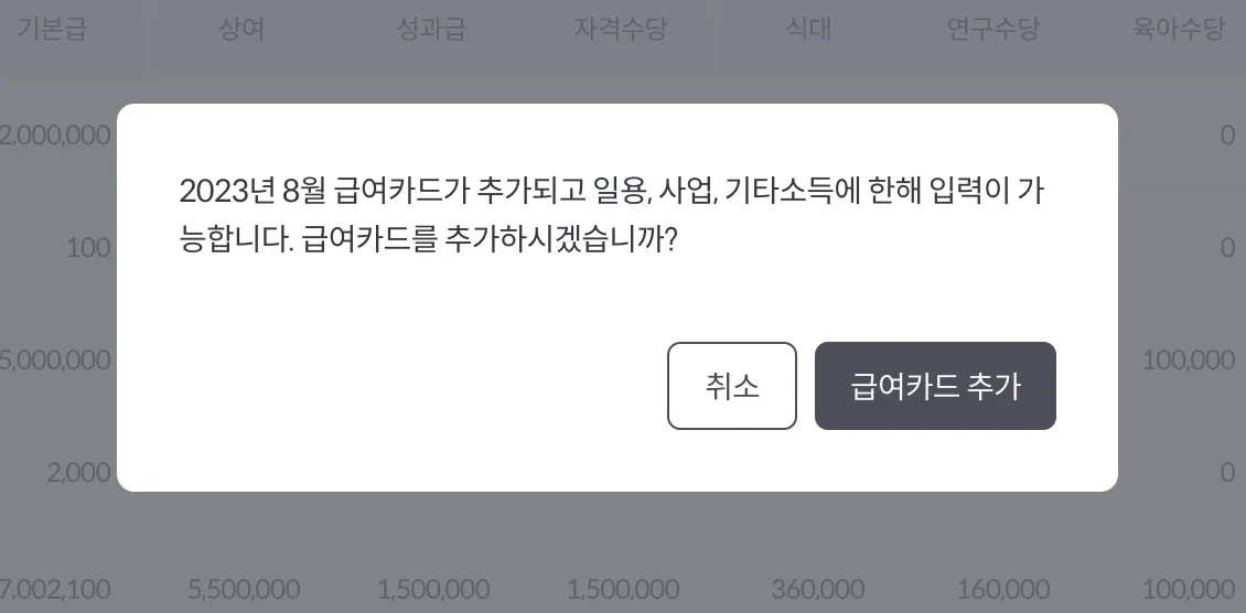 3. 노출되는 팝업에서 급여카드 추가 버튼을 선택합니다.
