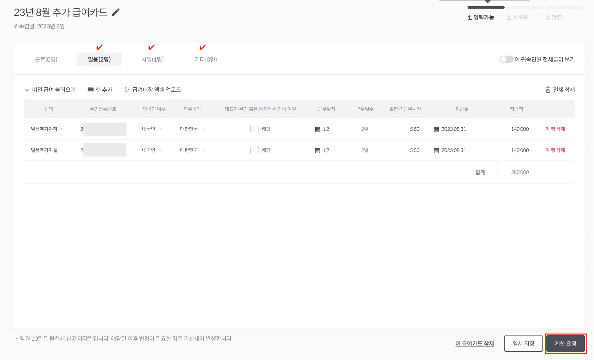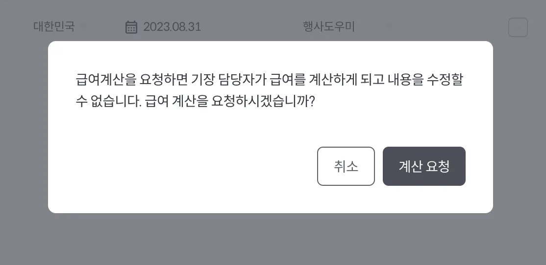예) 8월 XX일 입력 마감 → 8월 XX일 급여 지급 → 9월 10일 원천세 신고: 8월 5일까지 생성 및 계산요청 가능