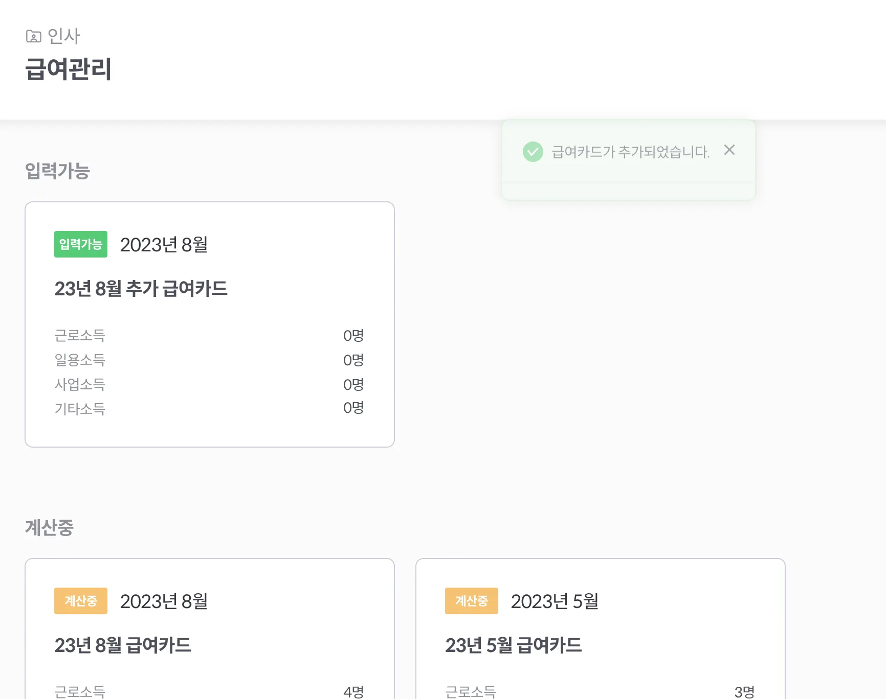 8. 담당자가 확인 후 계산이 완료된 추가 급여 카드는 완료 항목에 노출됩니다.