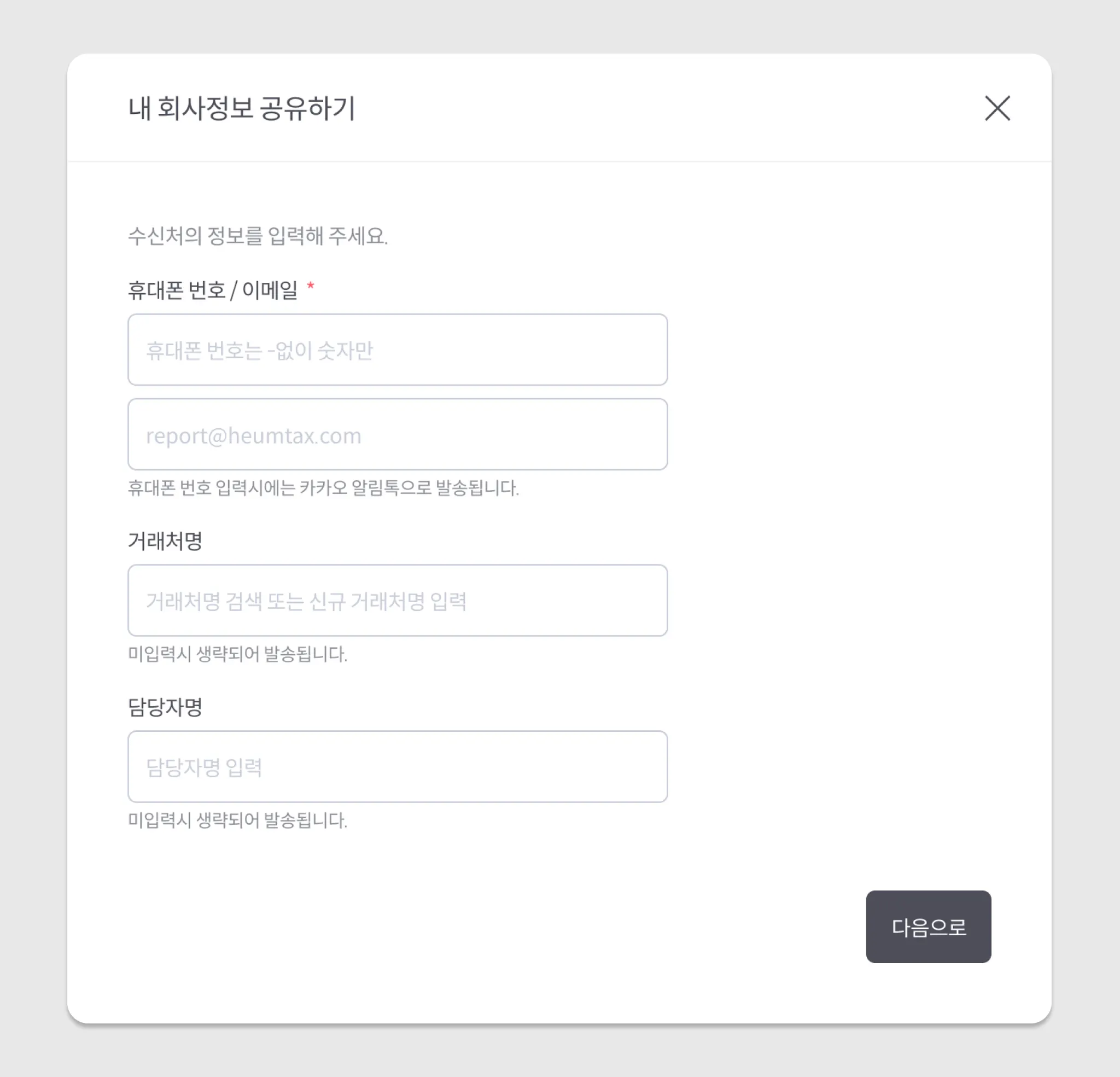 정보를 받으실 거래처 담당자(혹은 대표)의 휴대전화번호 혹은 이메일을 입력합니다.