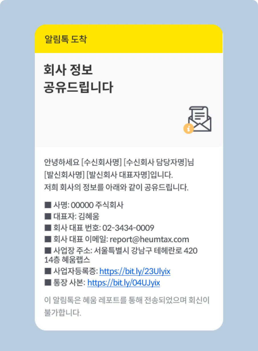 원하시는 거래처에 간단한 회사 정보, 세금계산서 발급과 대금 이체를 위한 정보들을 카카오톡과 메일로 보내주는 기능입니다.