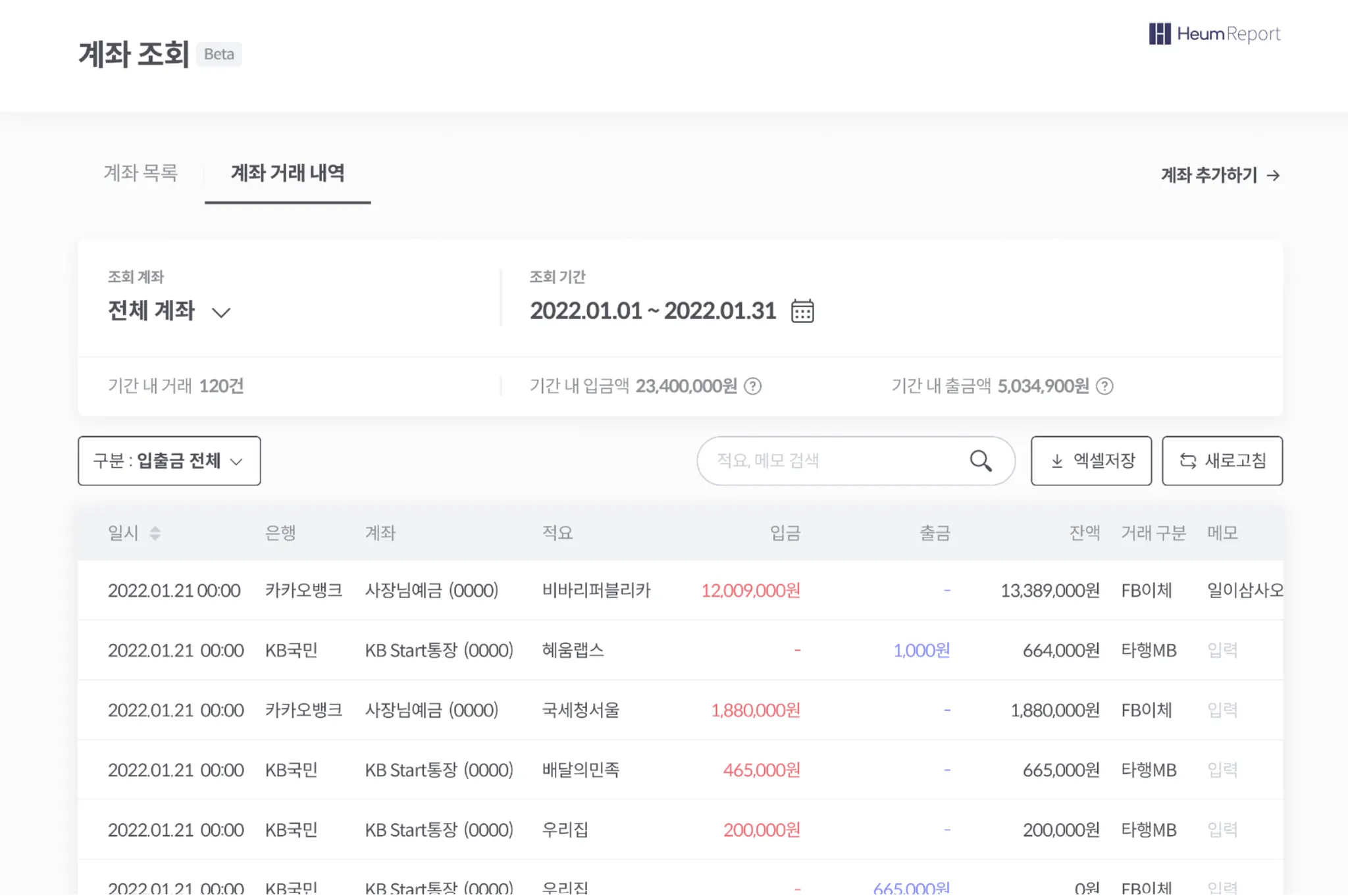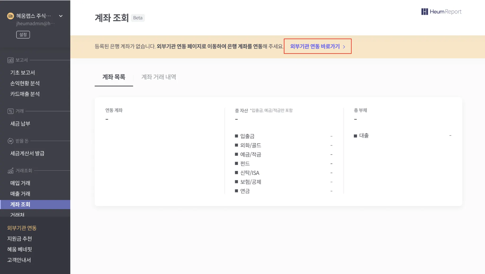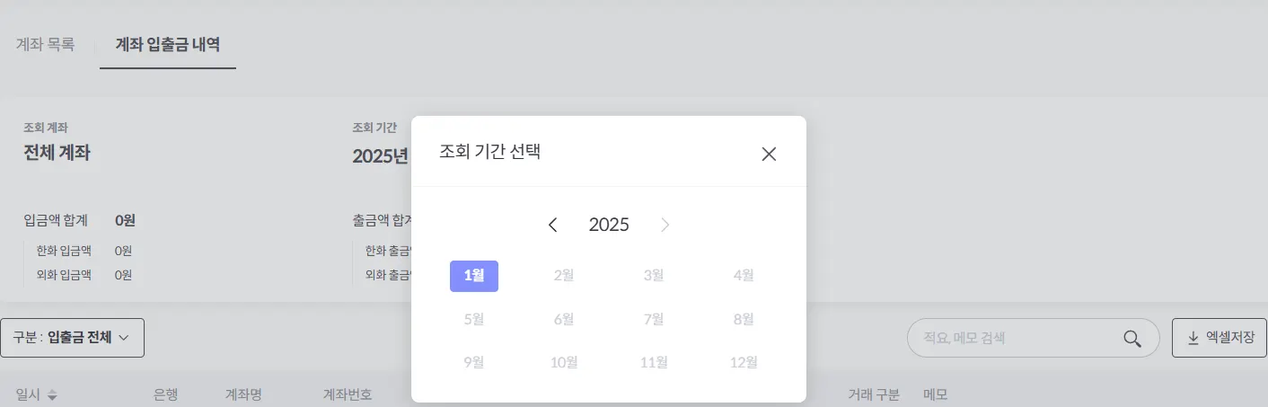 은행계좌 연동(인증서) 후, 바로 계좌 거래내역 조회가 가능합니다.