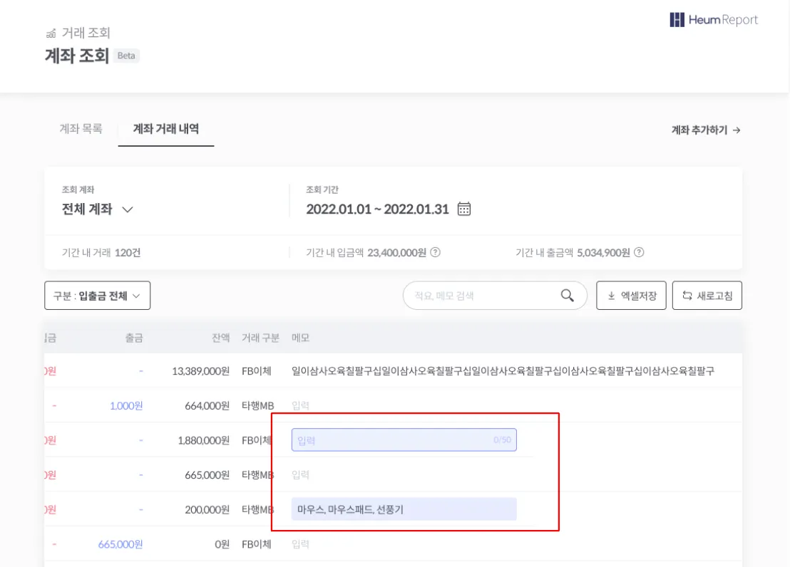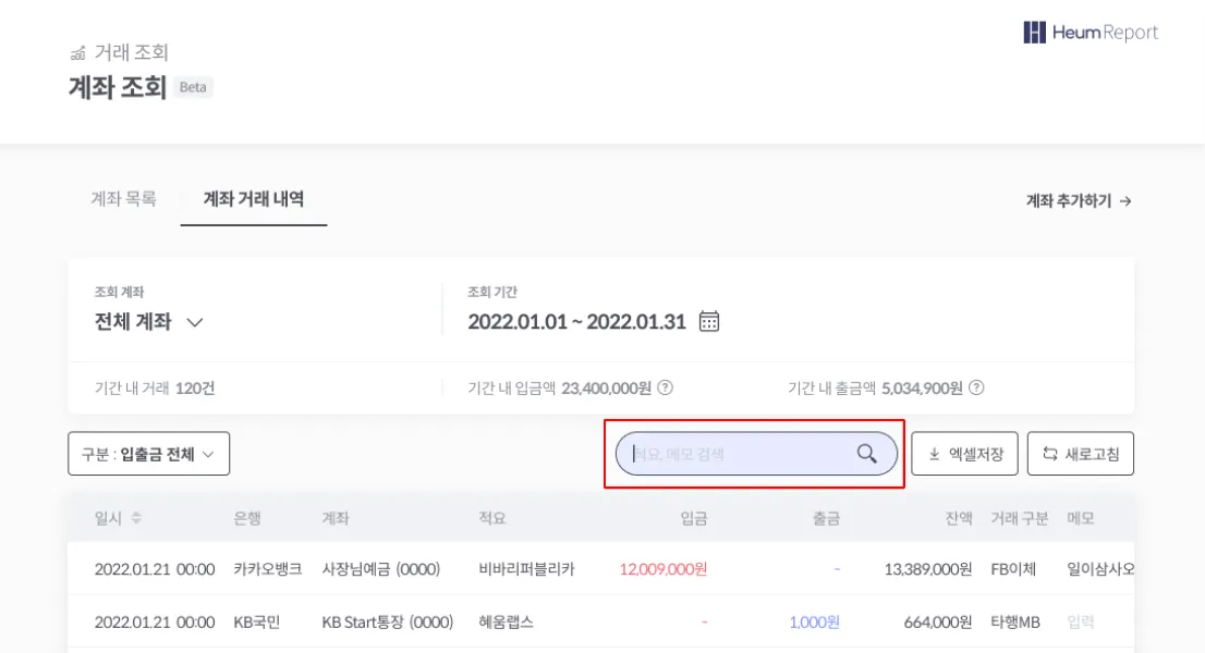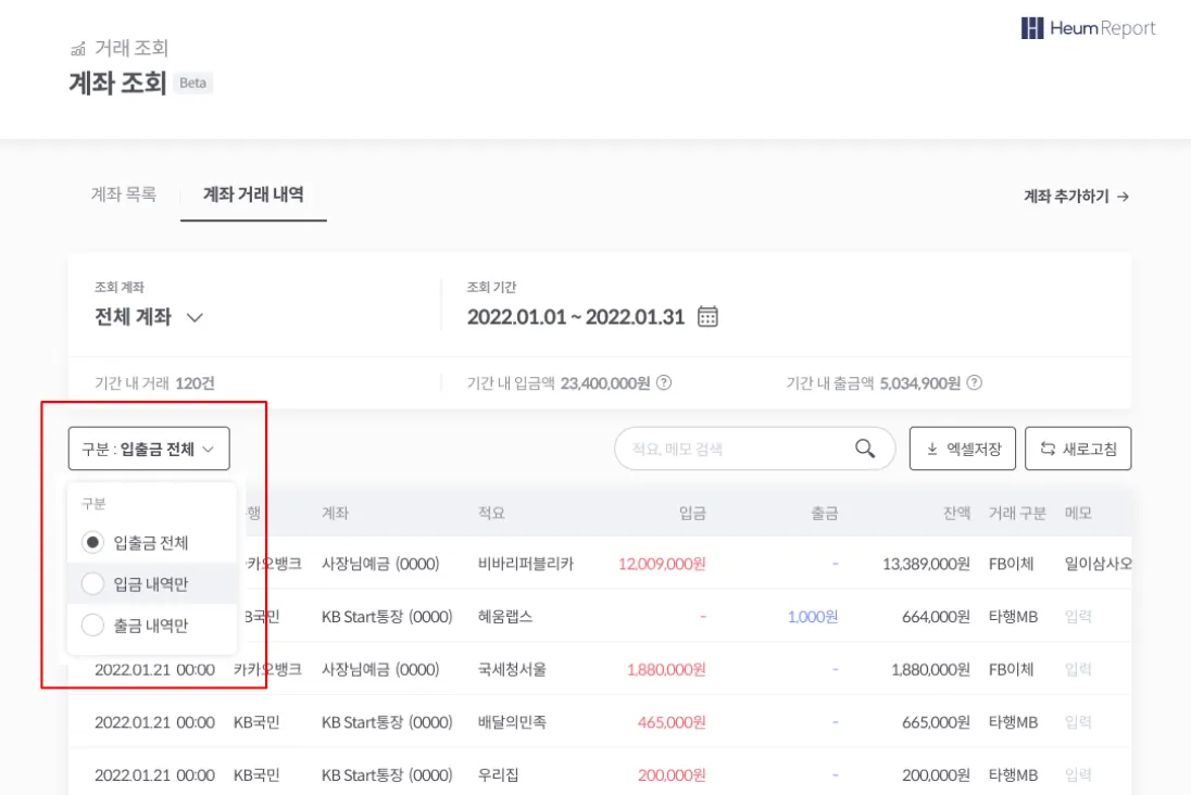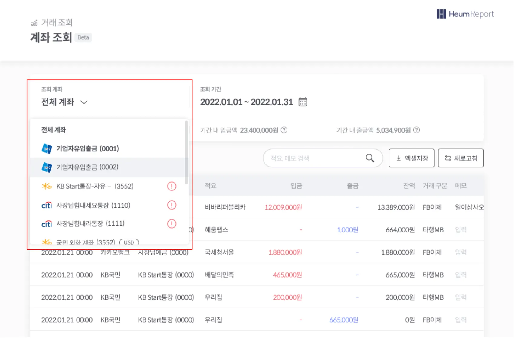 은행계좌 연동(인증서) 후, 바로 계좌 거래내역 조회가 가능합니다.