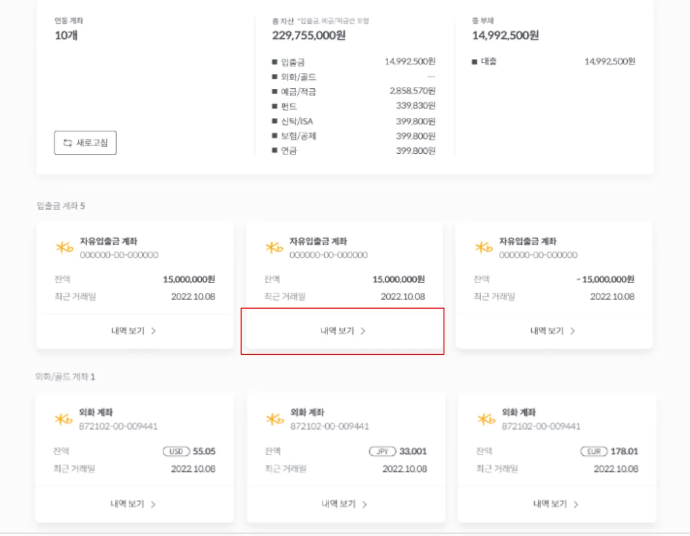 ‘입출금 계좌’와 ‘외화 계좌’의 경우에는 [내역 보기] 버튼을 통해