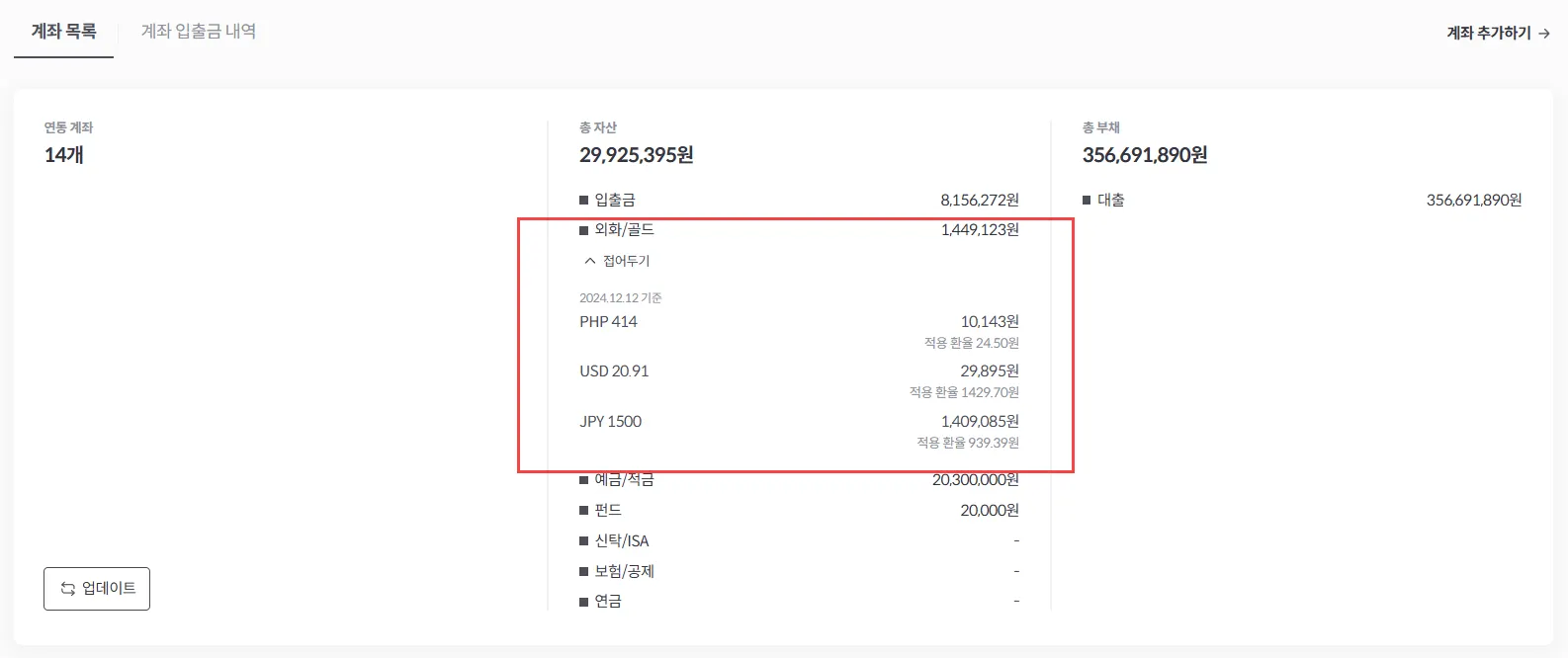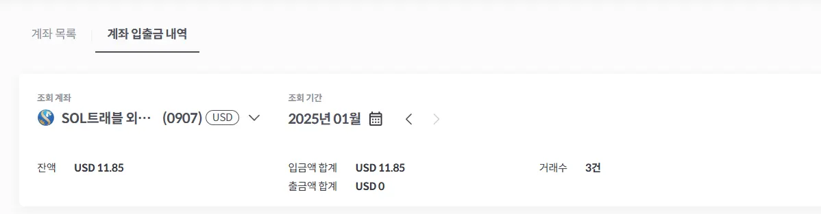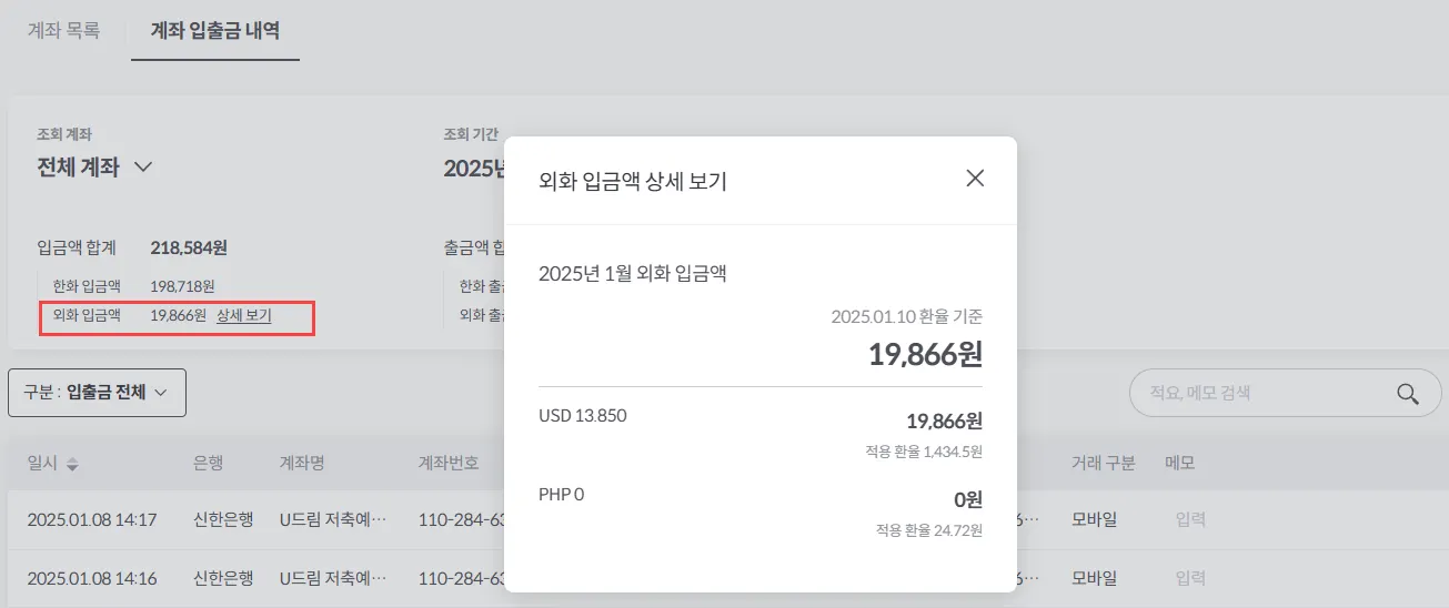 외화계좌별 외화 잔액 및 입출금 거래금액을 확인 할 수 있습니다.