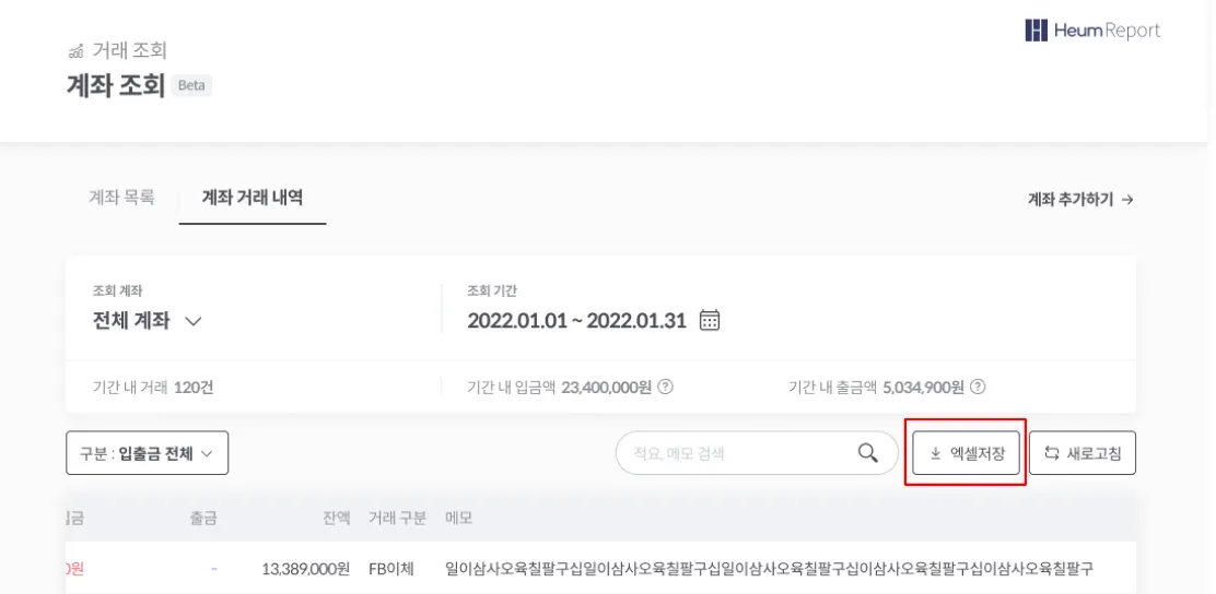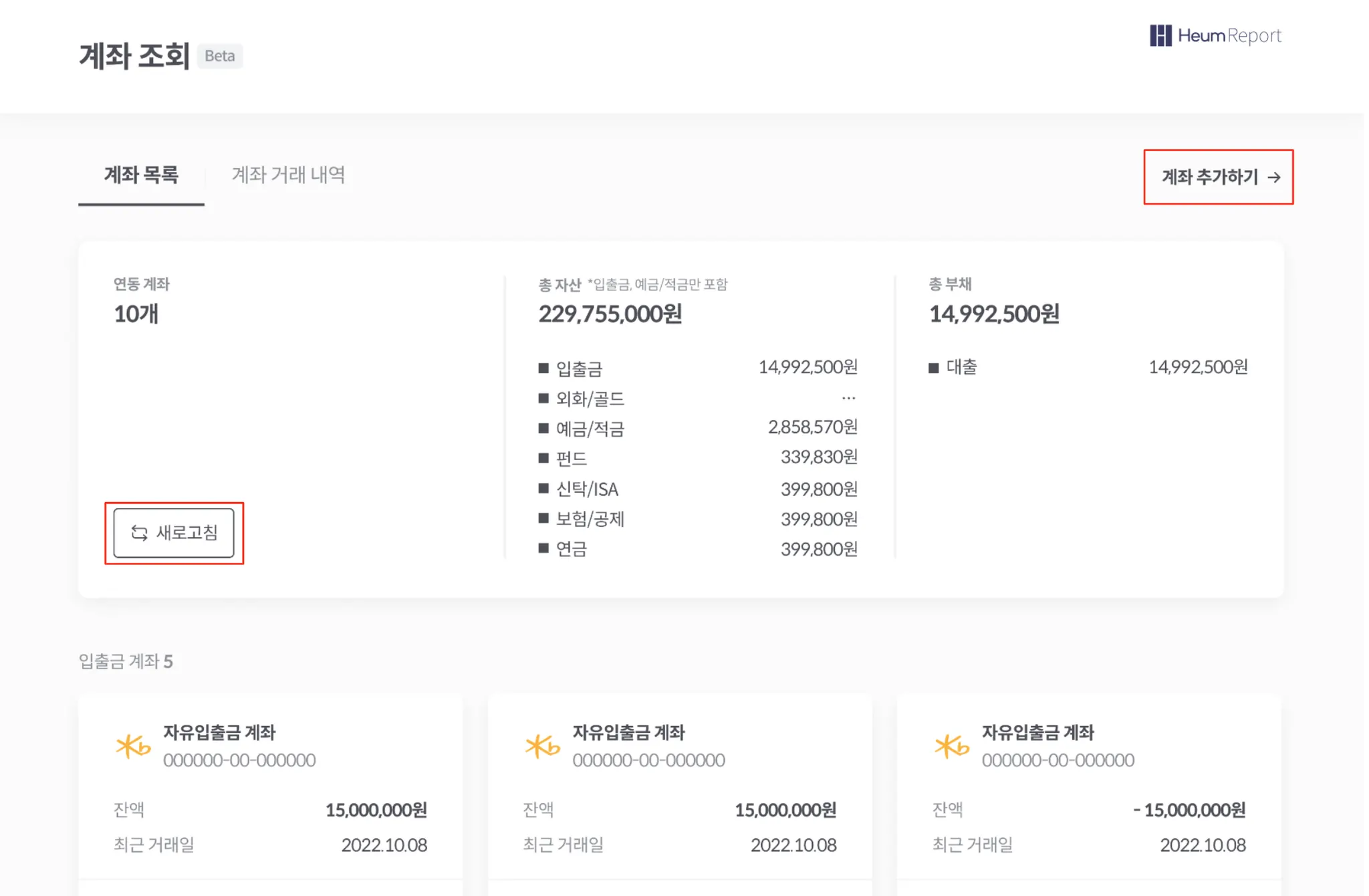 추가한 계좌의 거래 내역을 당장 조회하고 싶다면 [새로고침] 버튼을 클릭하여 확인할 수 있습니다.