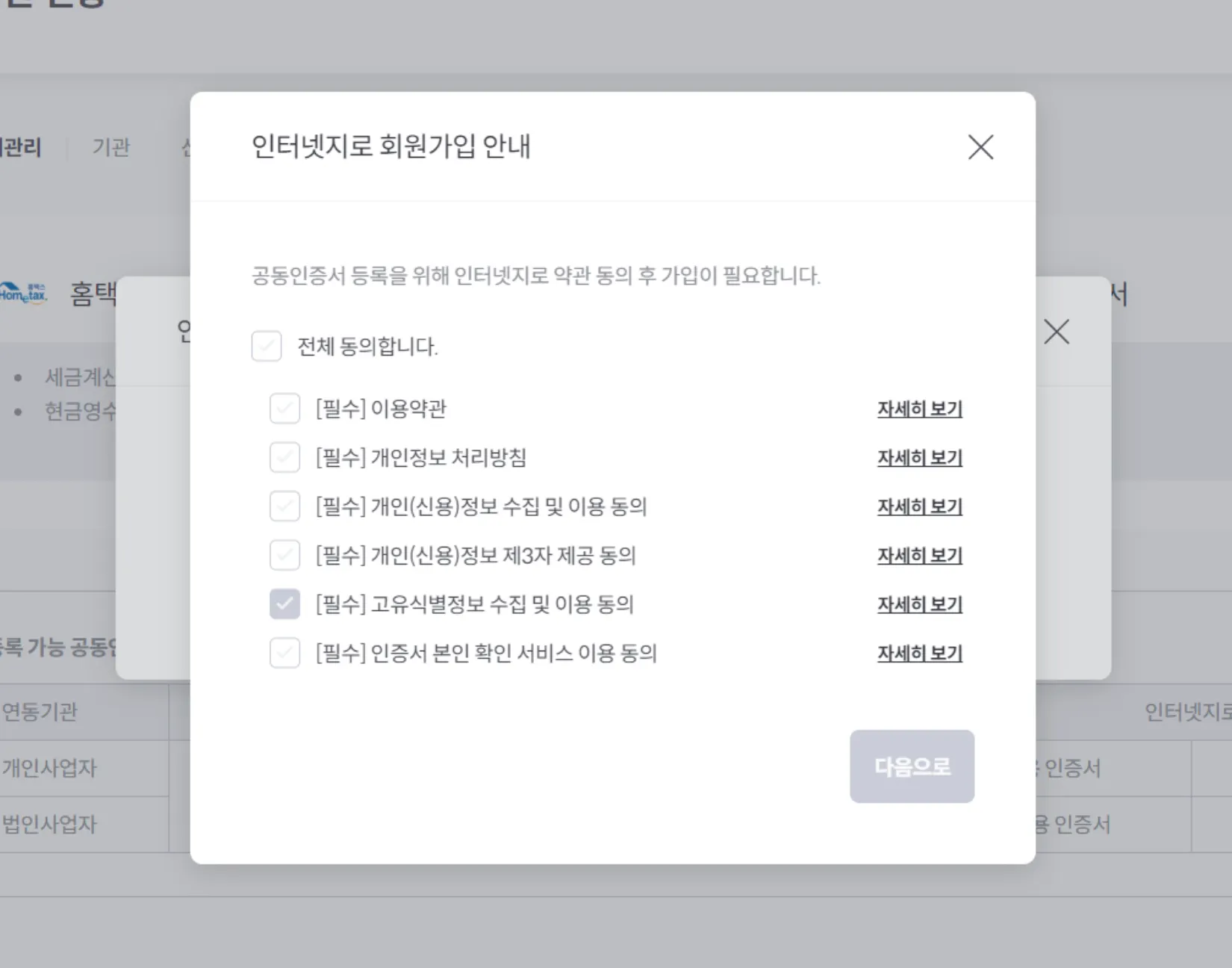 3-2. 인터넷지로 회원가입 팝업 발생 시(미가입 한 개인사업자, 법인 해당)