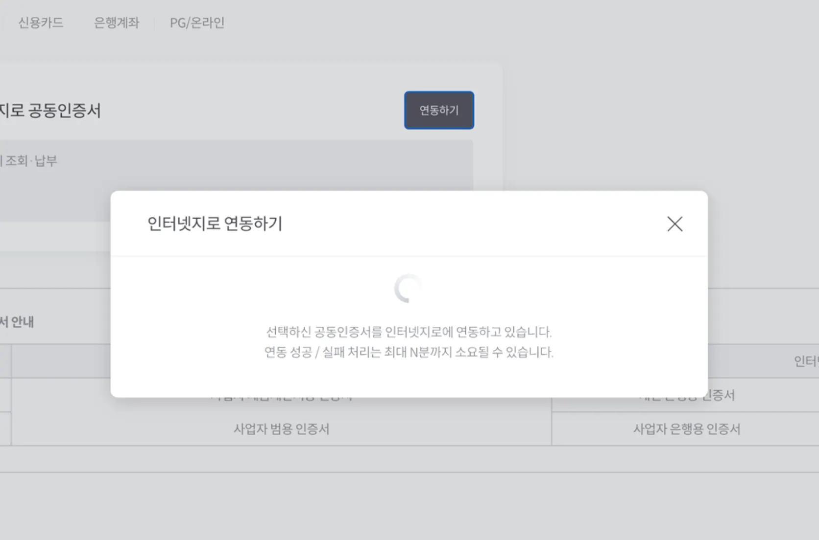 3. 비밀번호 일치 시 해당 인증서로 연동을 시도합니다.