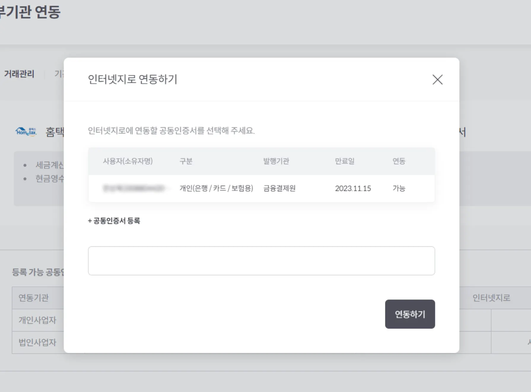 2. 연동할 공동인증서를 선택하여 비밀번호를 입력 후 연동하기를 선택해주세요. 연동 항목에서 가능 이라고 노출되는 인증서만 연동이 가능합니다.