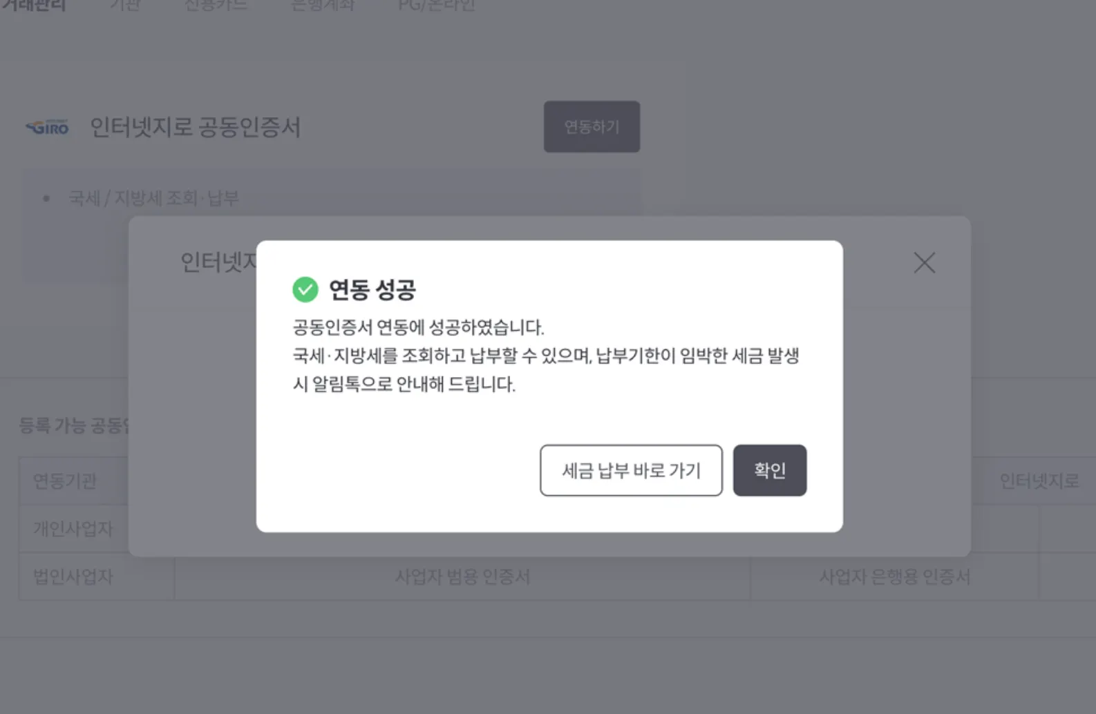 4. 연동에 성공 시 아래와 같은 팝업이 노출됩니다. 세금 납부 바로 가기 버튼을 통해 세금조회 및 납부가 가능합니다.