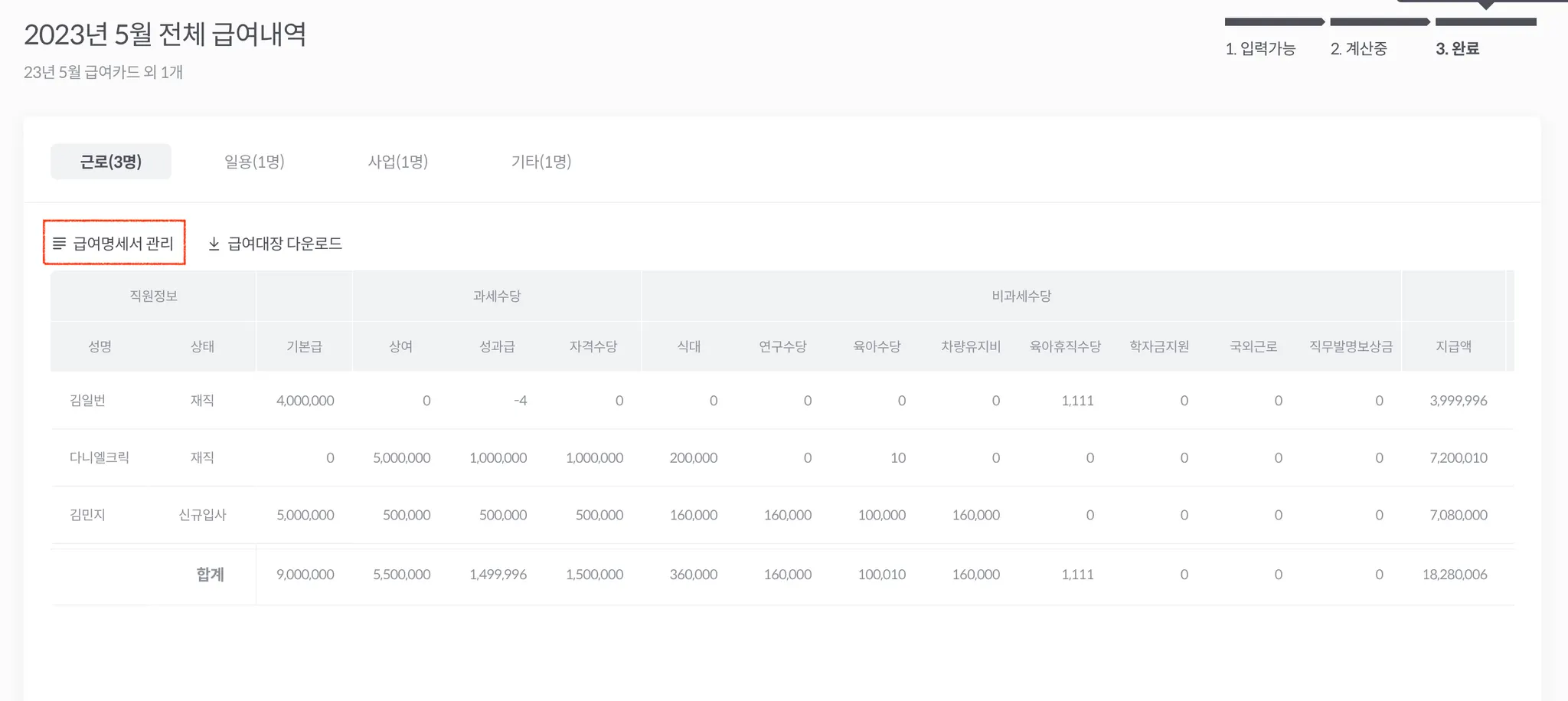 2. 근로 탭의 급여명세서 관리 버튼을 선택합니다.