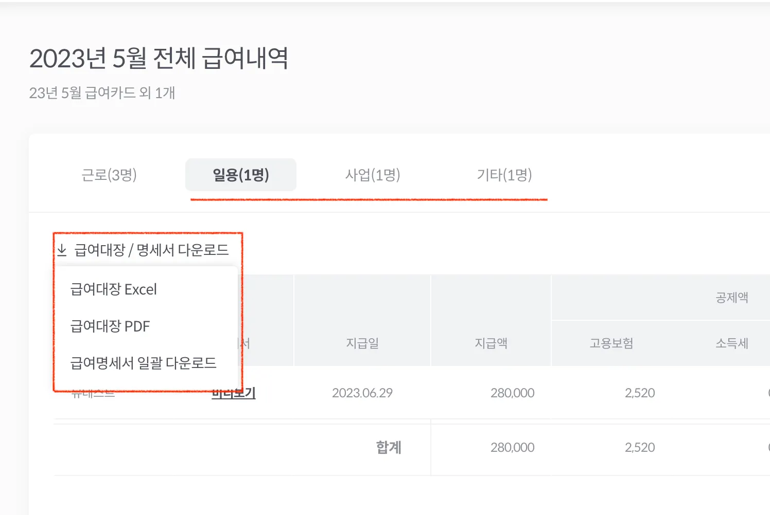 일용, 사업, 기타 소득자는 급여대장/명세서 다운로드 후 전달해주시면 됩니다.