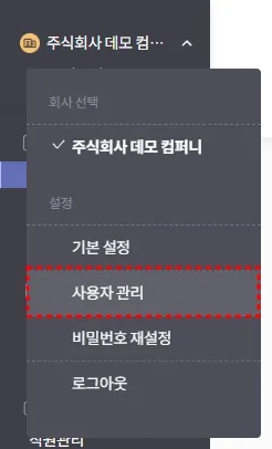 1. 회사 이름 메뉴에서 '사용자 관리' 메뉴를 클릭합니다.