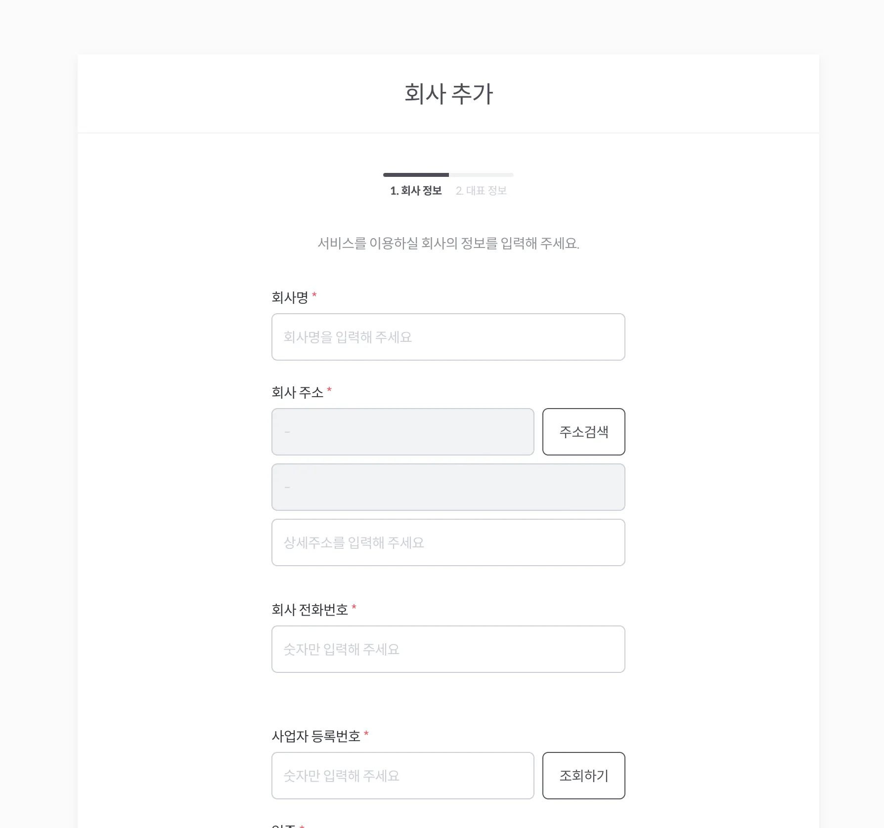 회사 추가 페이지에 진입하게 됩니다. 페이지에서 회사명, 주소, 전화번호, 사업자등록번호, 업종을 입력합니다. 이후 다음 버튼을 누릅니다.