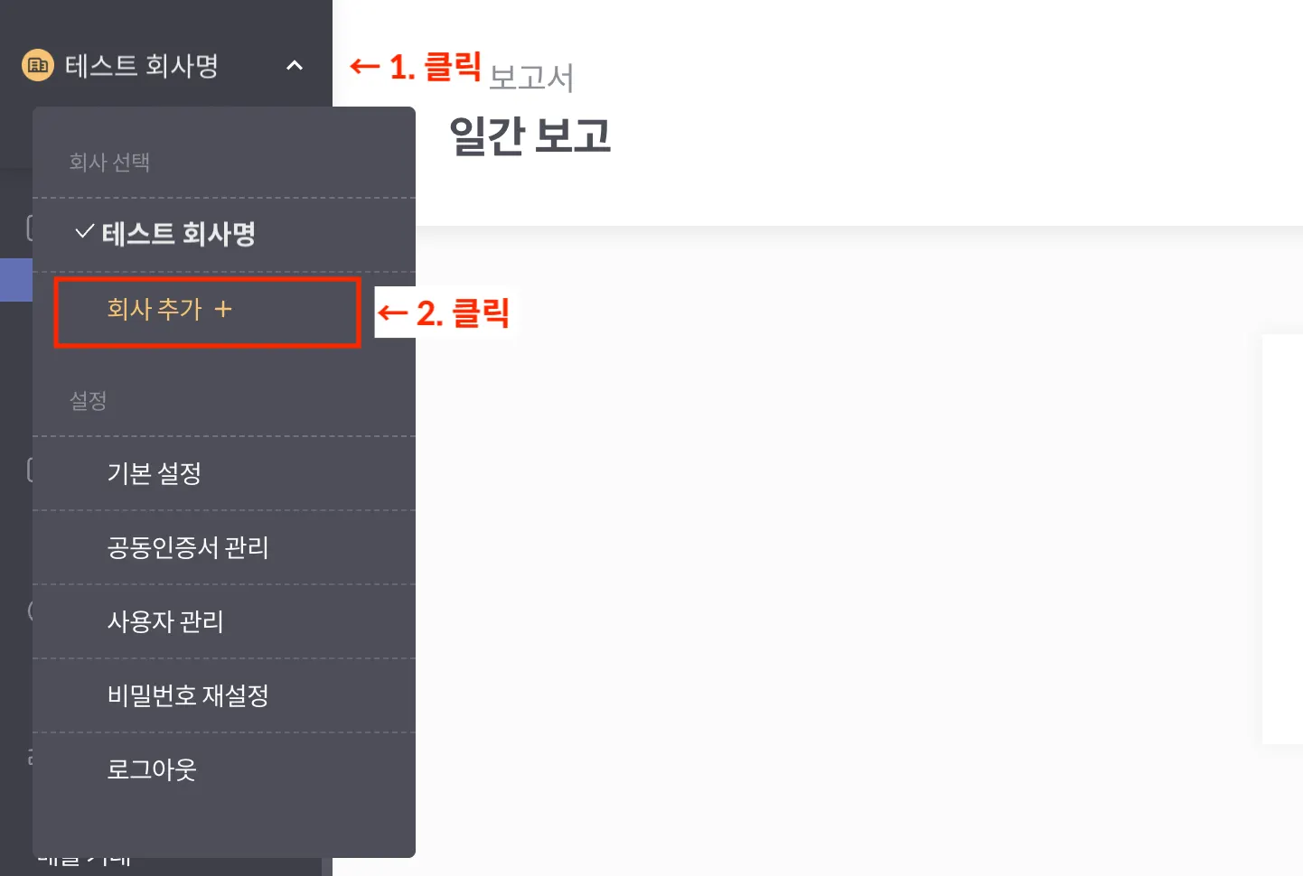 레포트 좌측 상단 고객님의 회사명을 클릭하신 뒤 +회사 추가 버튼을 선택합니다.