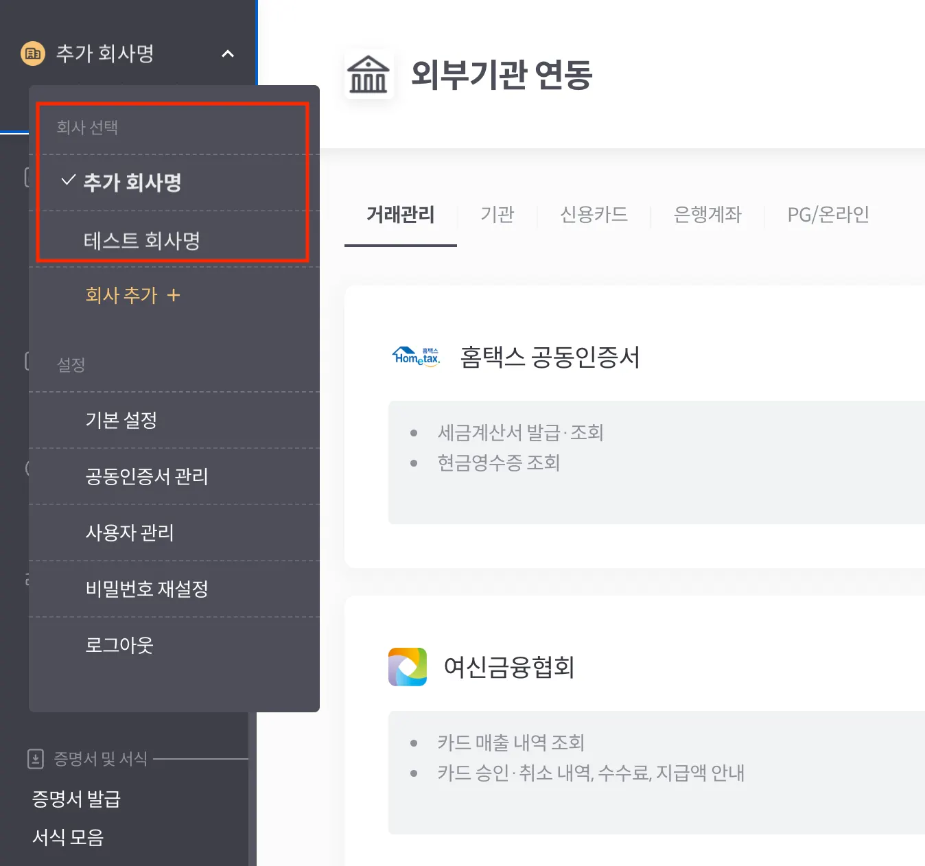 회사 추가 시, 추가한 회사의 매출-매입 조회, 세금납부, 세금계산서 발급이 가능합니다.