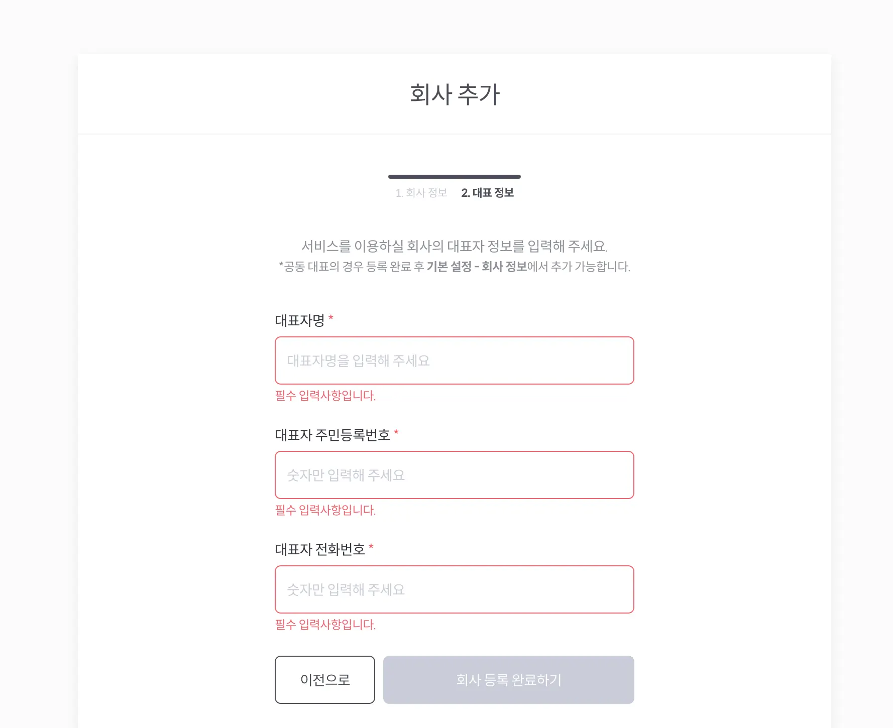 대표자명, 대표자 주민등록번호, 대표자 전화번호를 입력 후 회사 등록 완료하기 버튼을 선택합니다.