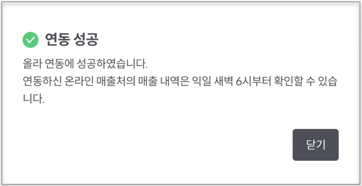 올라 연동이 진행되며, 연동 성공 시 연동 성공 팝업이 노출되며, 익일 6시부터 [매출거래 - 온라인 매출]에서 ‘온라인 매출 내역’을 조회할 수 있습니다.