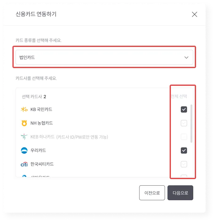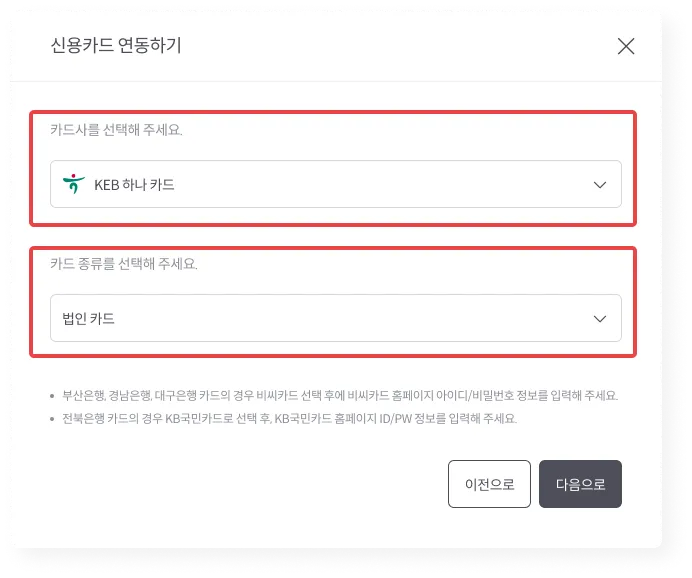 연동하려는 카드사와 개인/법인 카드여부를 선택 후 다음으로 넘어갑니다