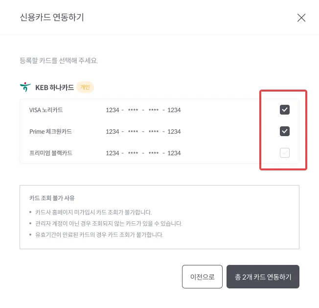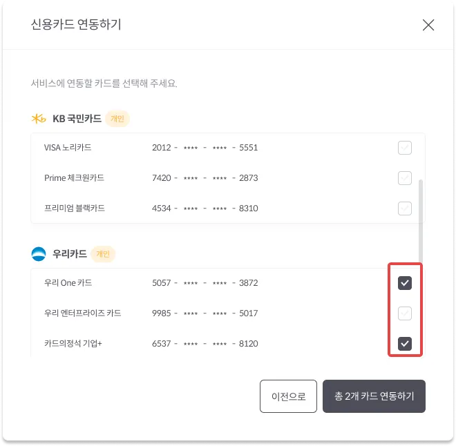 카드사별로 연동하려는 카드를 체크 후 연동을 완료합니다.