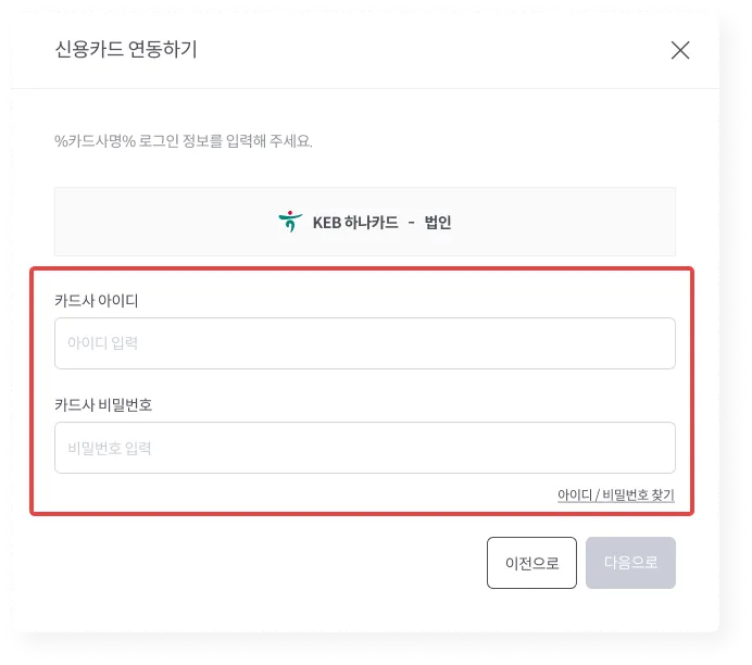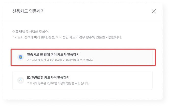 하나/롯데/삼성 법인 카드의 경우에는 인증서 연동을 지원하지 않기 때문에 ID/PW 기반으로만 연동할 수 있습니다.