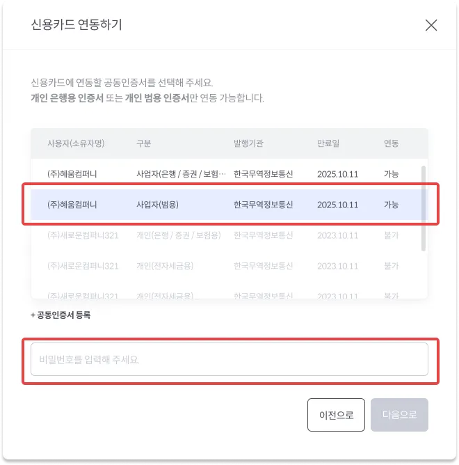 연동하고자 하는 인증서를 선택하고, 비밀번호를 입력 후 다음으로 넘어갑니다.