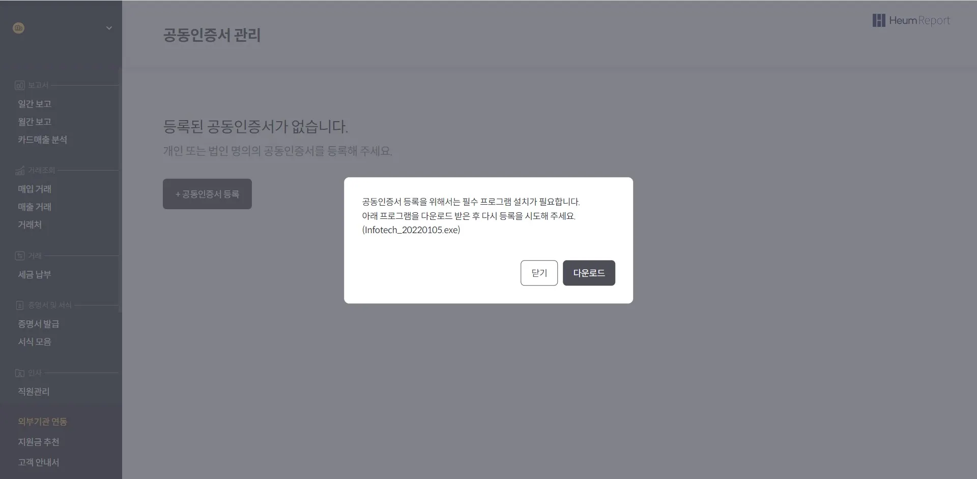 해당 인증서는 등록할 수 없는 인증서라고 팝업이 발생해요.