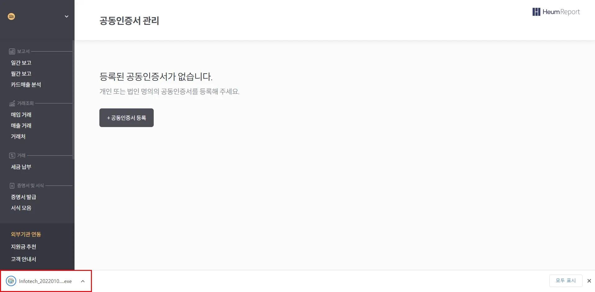 * 개인사업자: 사업자 명의의 범용, 전자세금용 공동인증서. 개인 명의의 은행용 혹은 범용 공동인증서