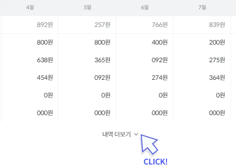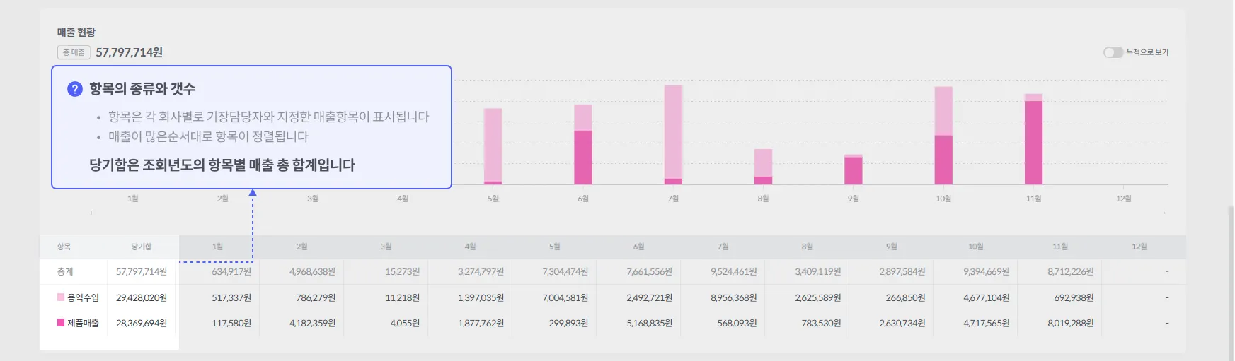 상위 5개 매출항목이 표 및 그래프에 표시됩니다. 표에서 ‘내역 더보기’를 클릭하시면 전체 매출항목 데이터를 확인할 수 있습니다.
