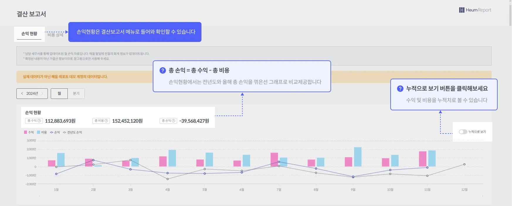 기존 [결산보고서 > 손익현황 분석]이 손익현황/ 비용상세로 분리되어 더욱 상세하게 제공됩니다.