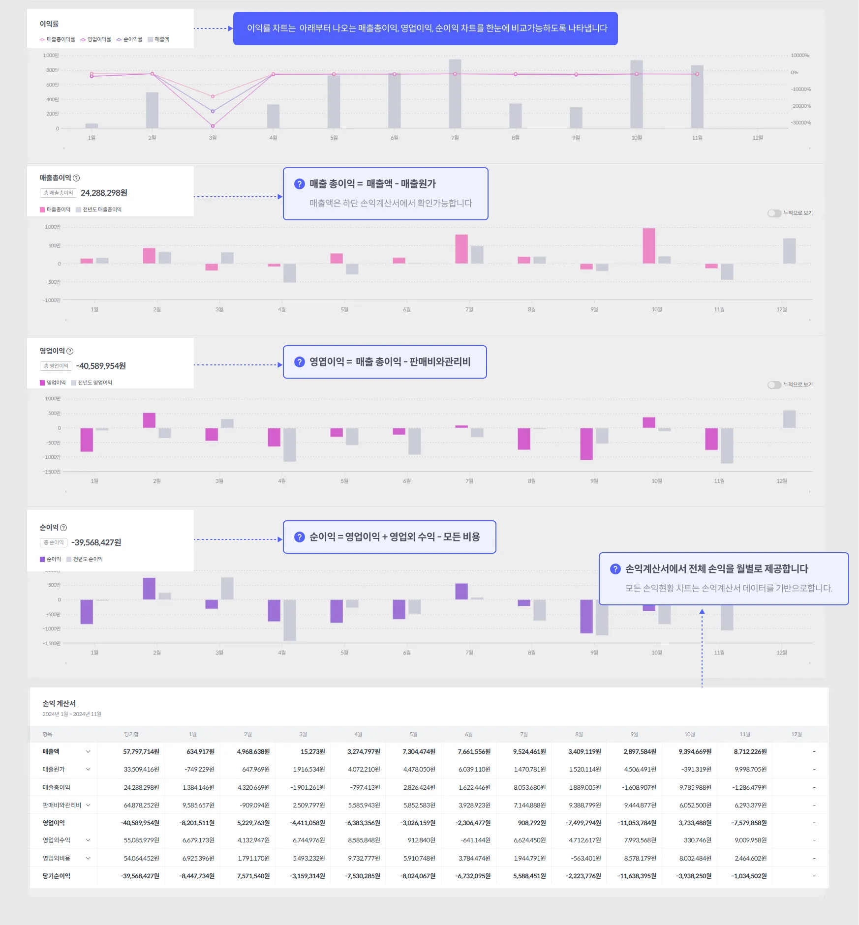 손익현황 : 총 수익 및 총 비용을 통한 총 손익관련 데이터를 보고서로 제공합니다.