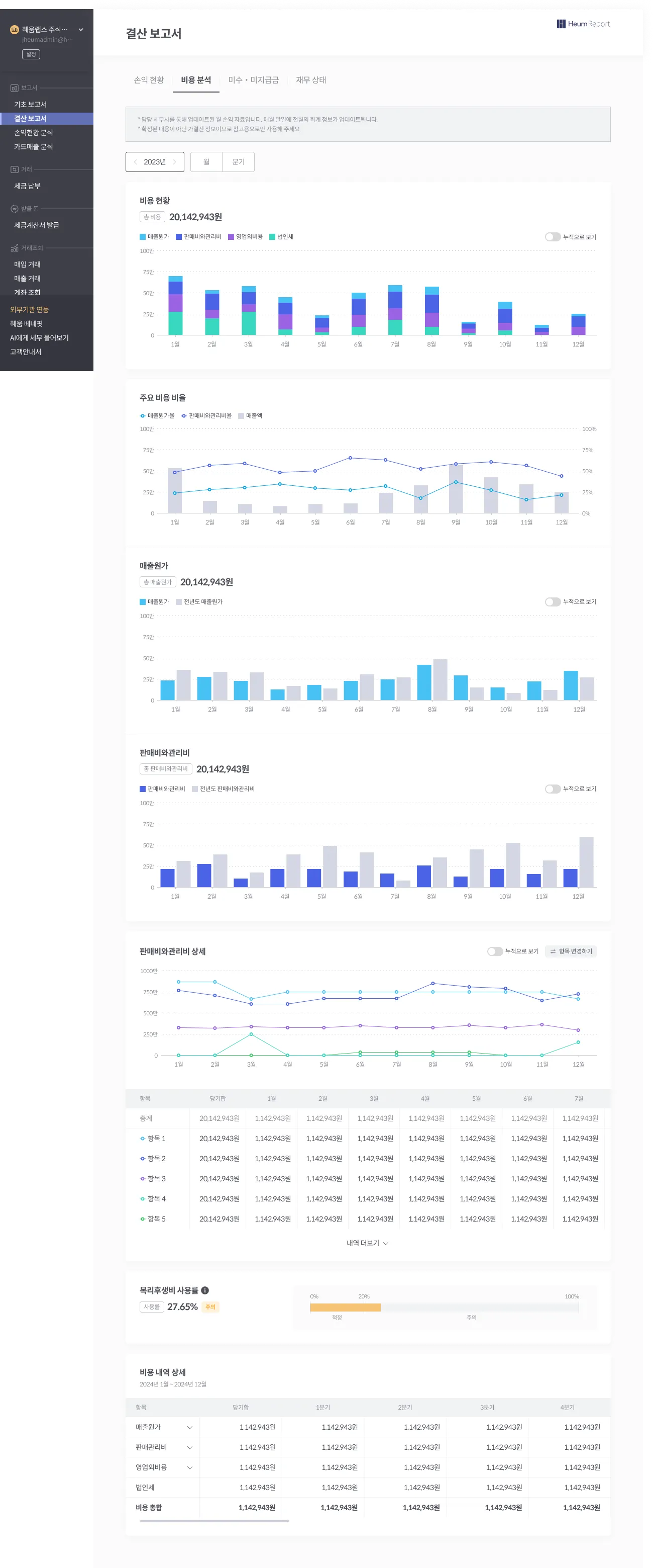 비용 추이 파악 뿐 아니라, 전체 비용 및 항목별 구성, 전년도 비교와 주요 비용 사용률을 참고하여, 비용 컨트롤에 도움