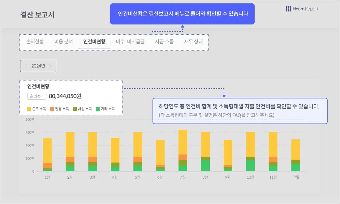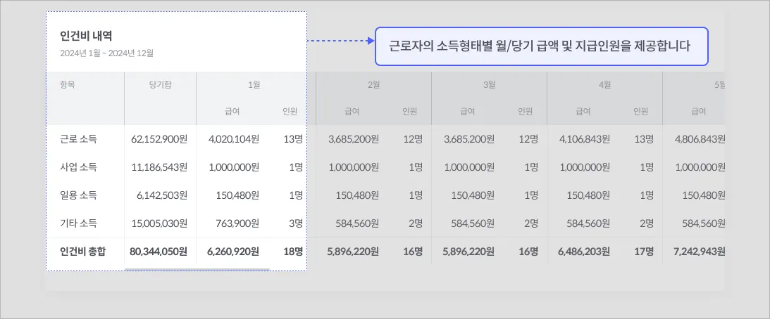 인건비현황 : 근로, 일용, 사업, 기타 등 소득 형태별 인건비 및 총 인건비 현황을 파악할 수 있습니다.