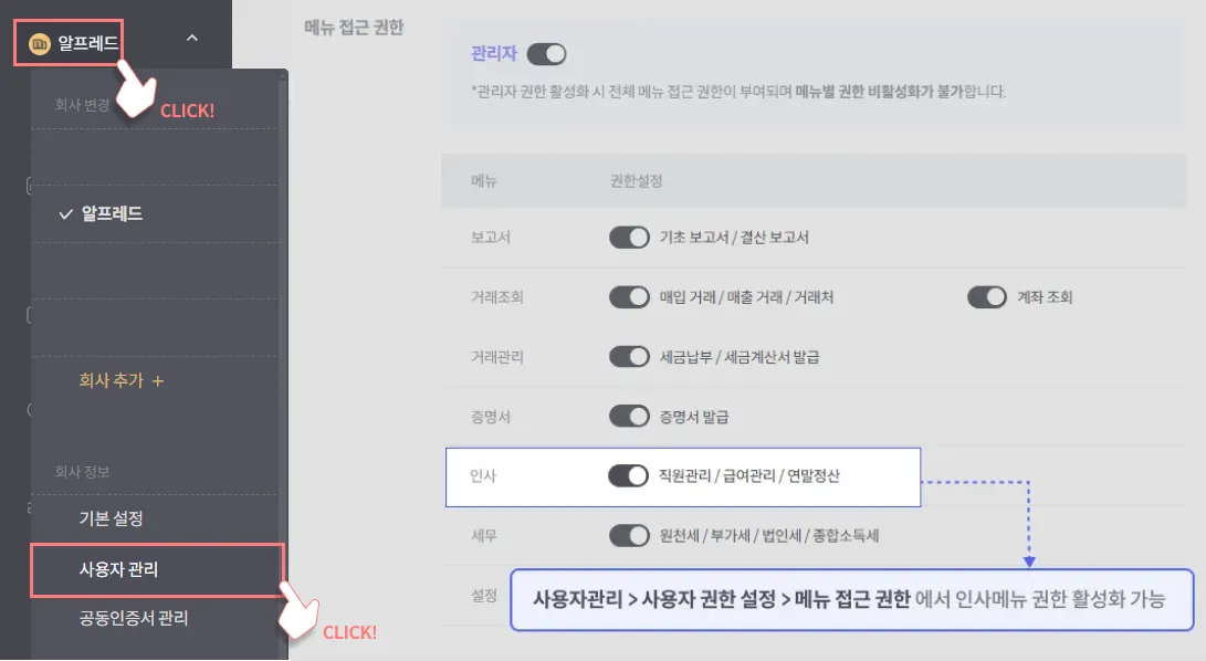 레포트 좌상단 회사명 클릭 > 회사정보 > 사용자 관리 에서 관리자가 소속 직원의 인사 메뉴 접근 권한을 설정할 수 있습니다.