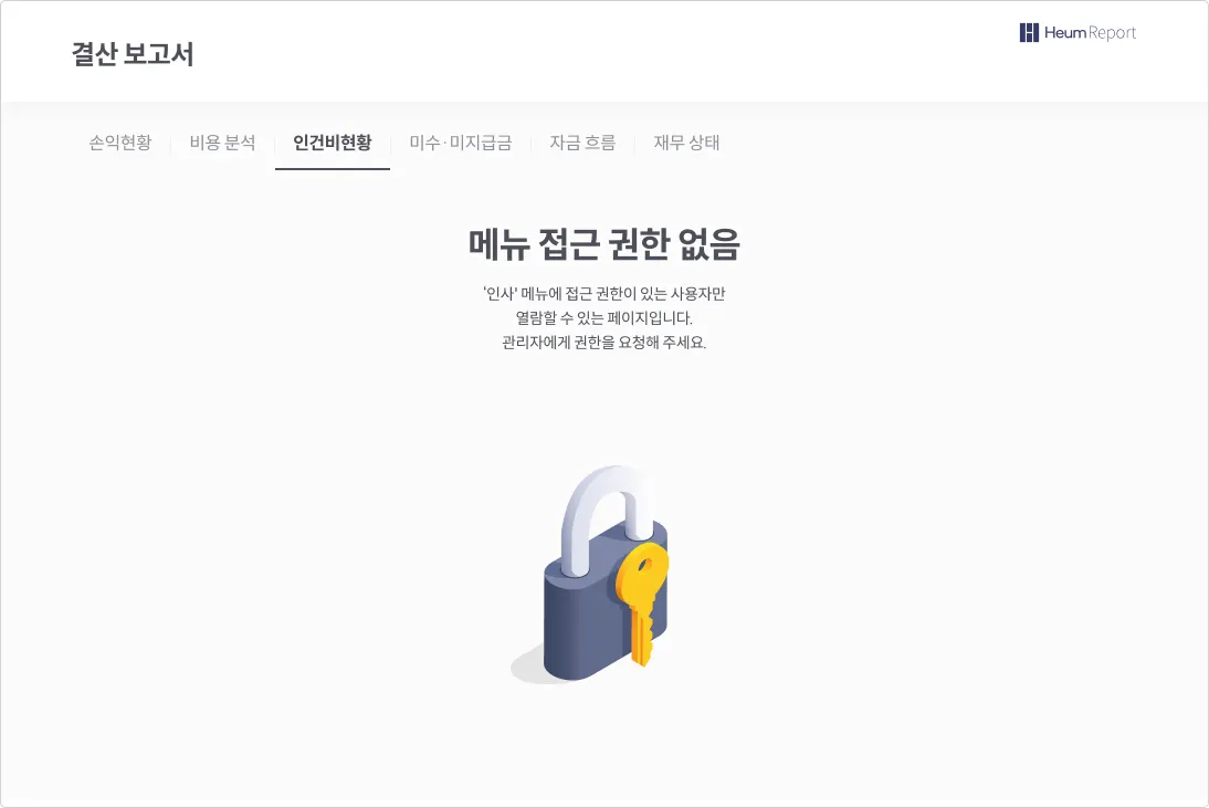 일반 직원들에게 공개되지 않는 인건비의 특성상 레포트 인사 메뉴에 접근 권한이 있는 직원/관리자만 인건비현황 보고서를 열람할 수 있습니다.