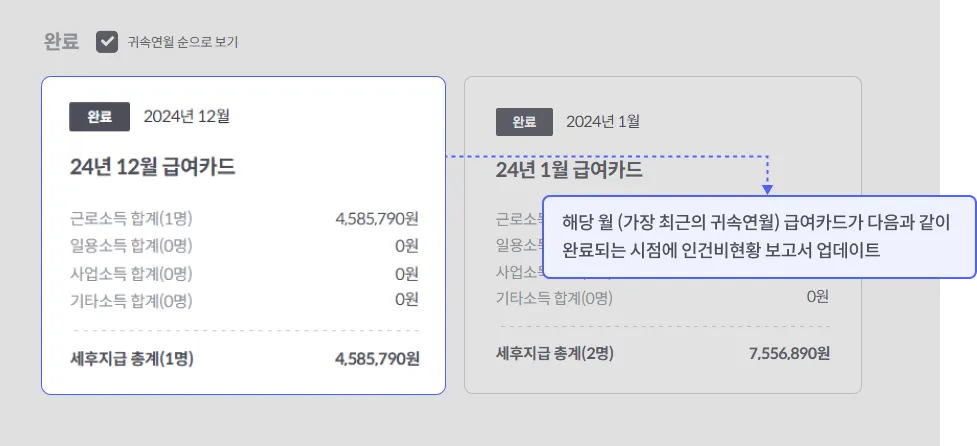 인건비현황 보고서는 기장 담당자의 급여카드 계산 완료시 업데이트 됩니다.