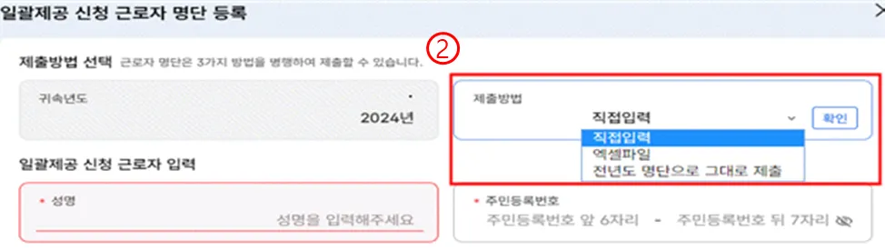 ② 직접입력 / 엑셀파일 / 전년도 명단 제출 중 선택하여 입력