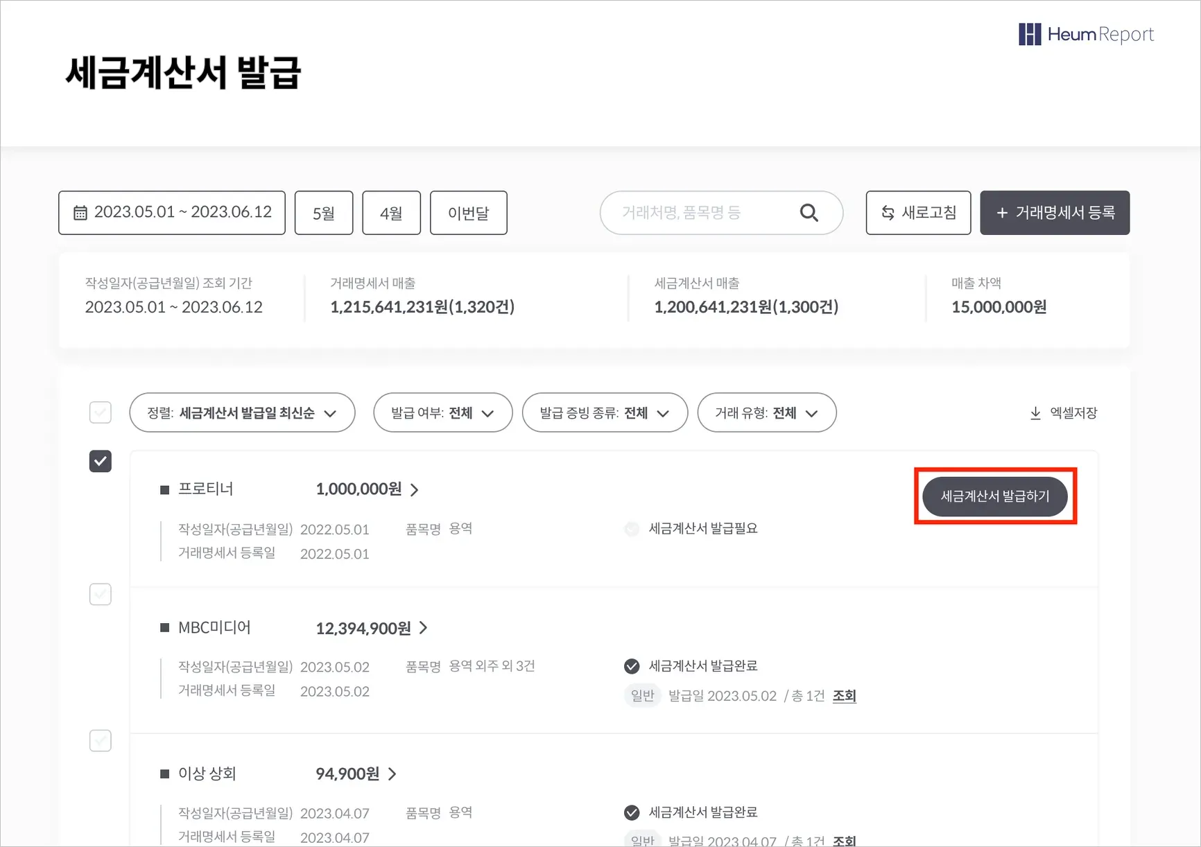 1. 리스트에서 발급을 원하는 명세서의 세금계산서 발급 버튼을 선택합니다.