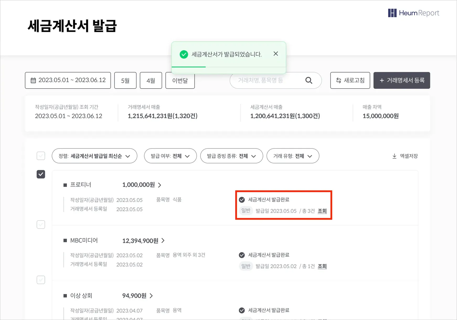 3. 발급이 완료되며, 리스트에서 세금계산서가 발급된 것을 확인할 수 있습니다.
