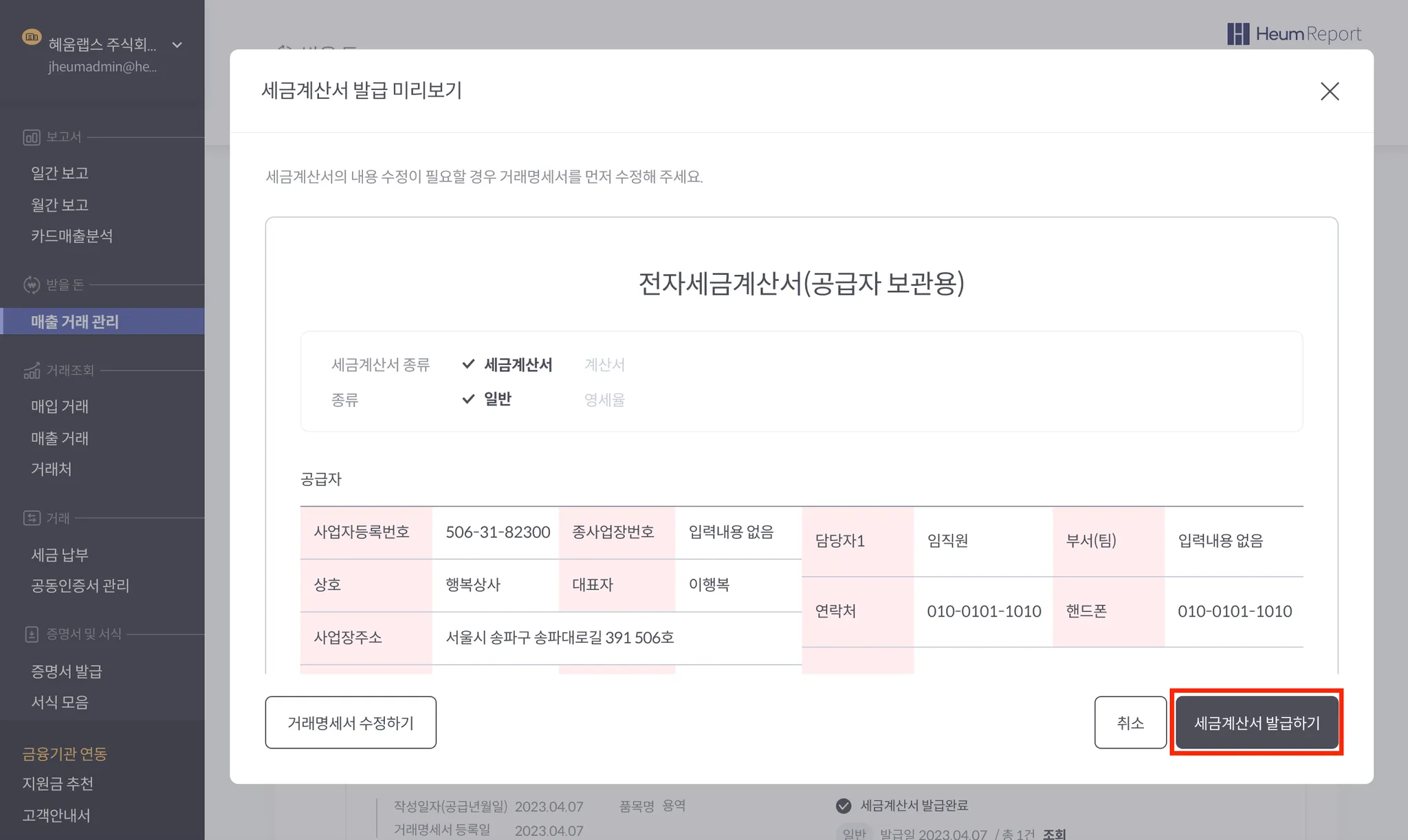 2. 세금계산서 발급 미리보기 팝업에서 발급할 내용을 확인 후 세금계산서 발급하기 버튼을 선택합니다.