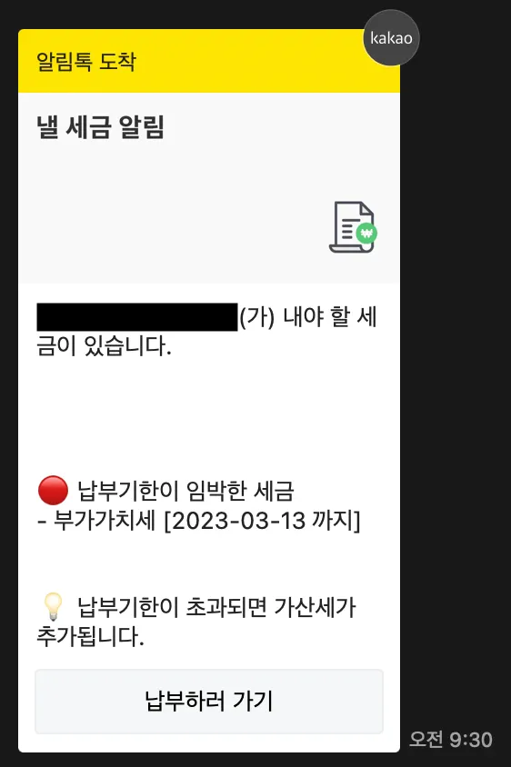 평일 오전 09:30에 납부기한이 임박한 세금이 있을 시 발송됩니다.