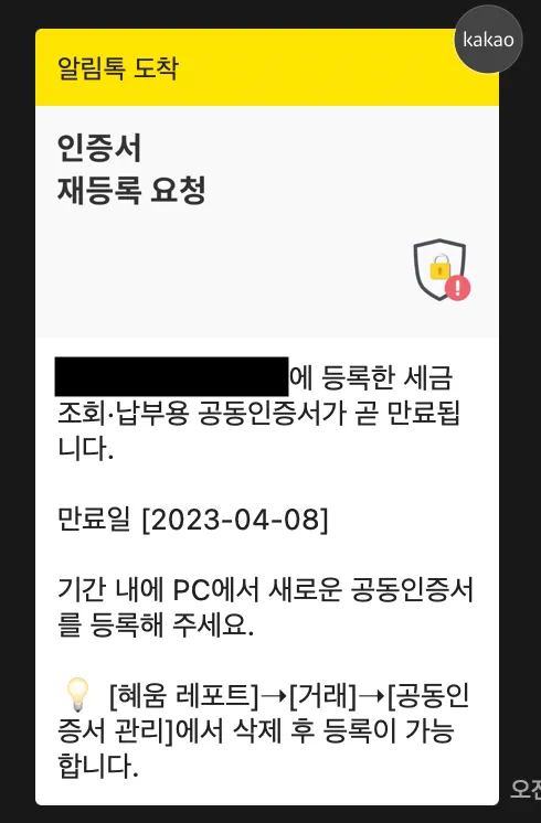 등록된 공동인증서로 세금 조회가 불가능할때 최초 1회 발송됩니다.