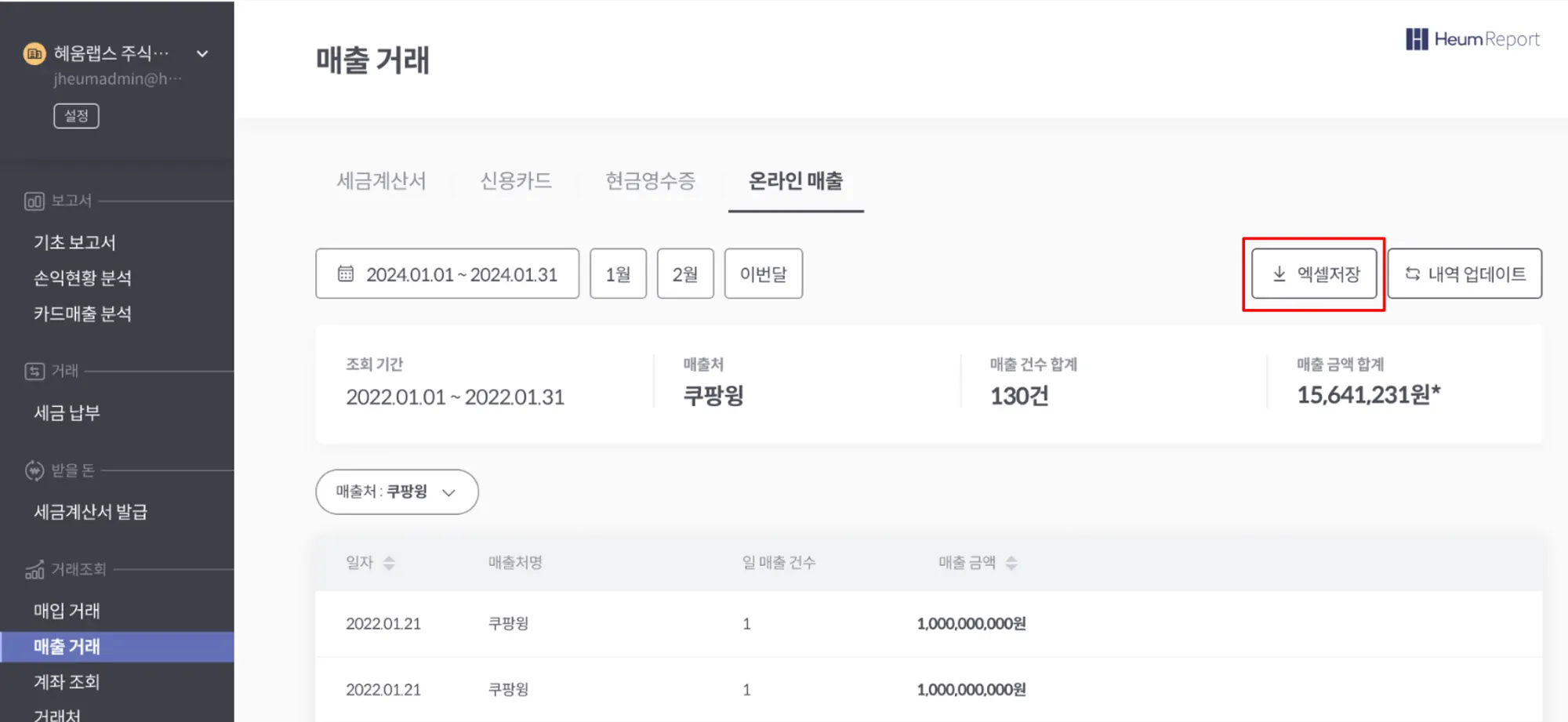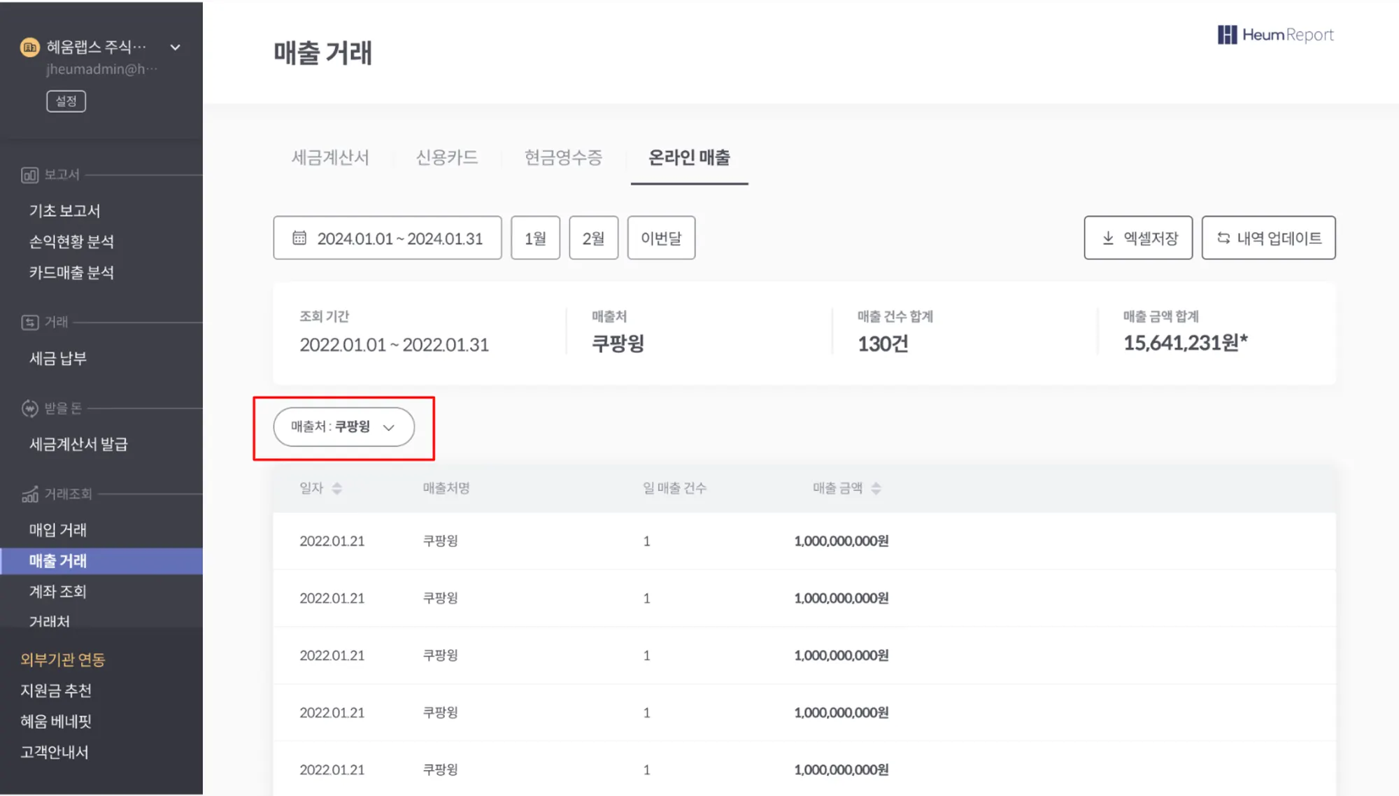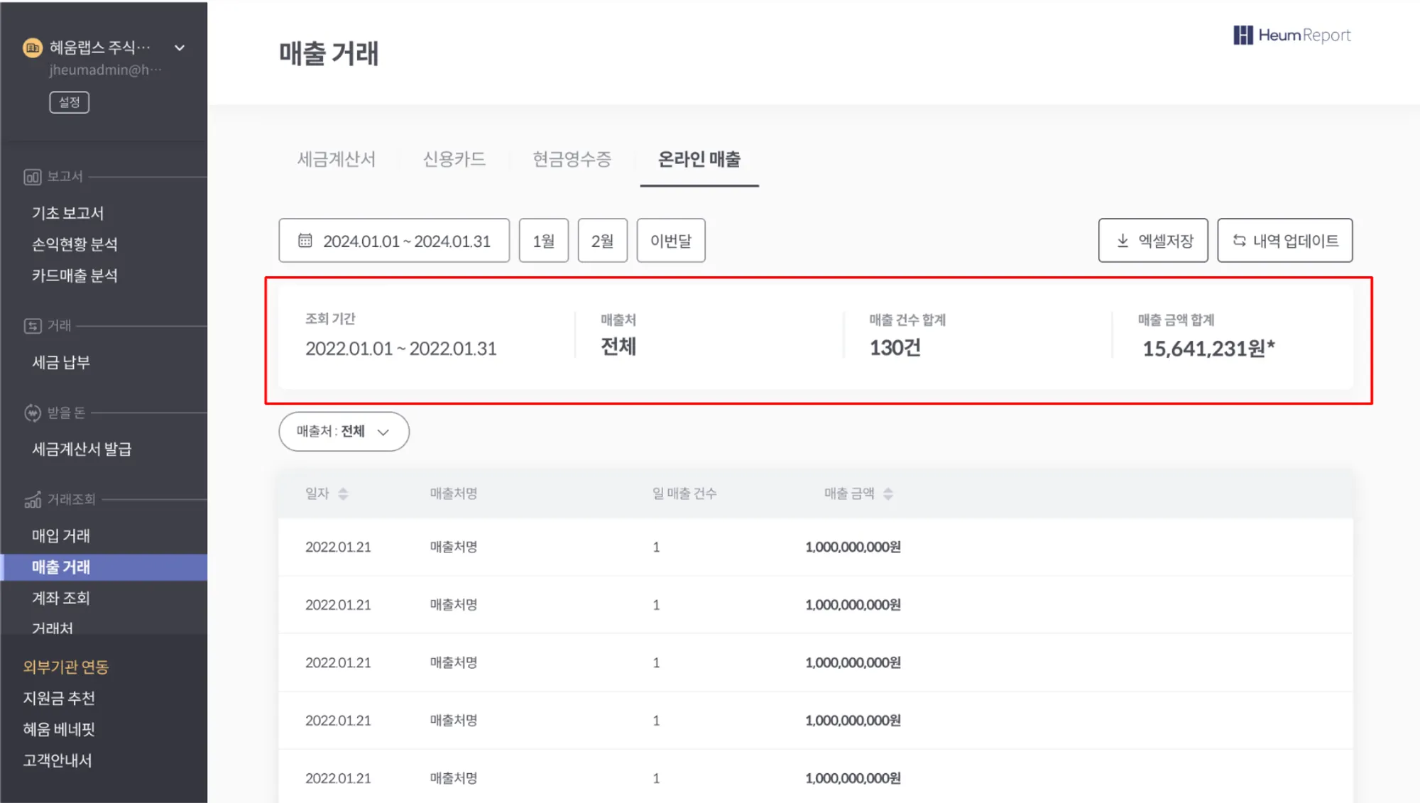 온라인 매출처 별 매출 유형(결제증빙 수단) 확인이 가능한가요?