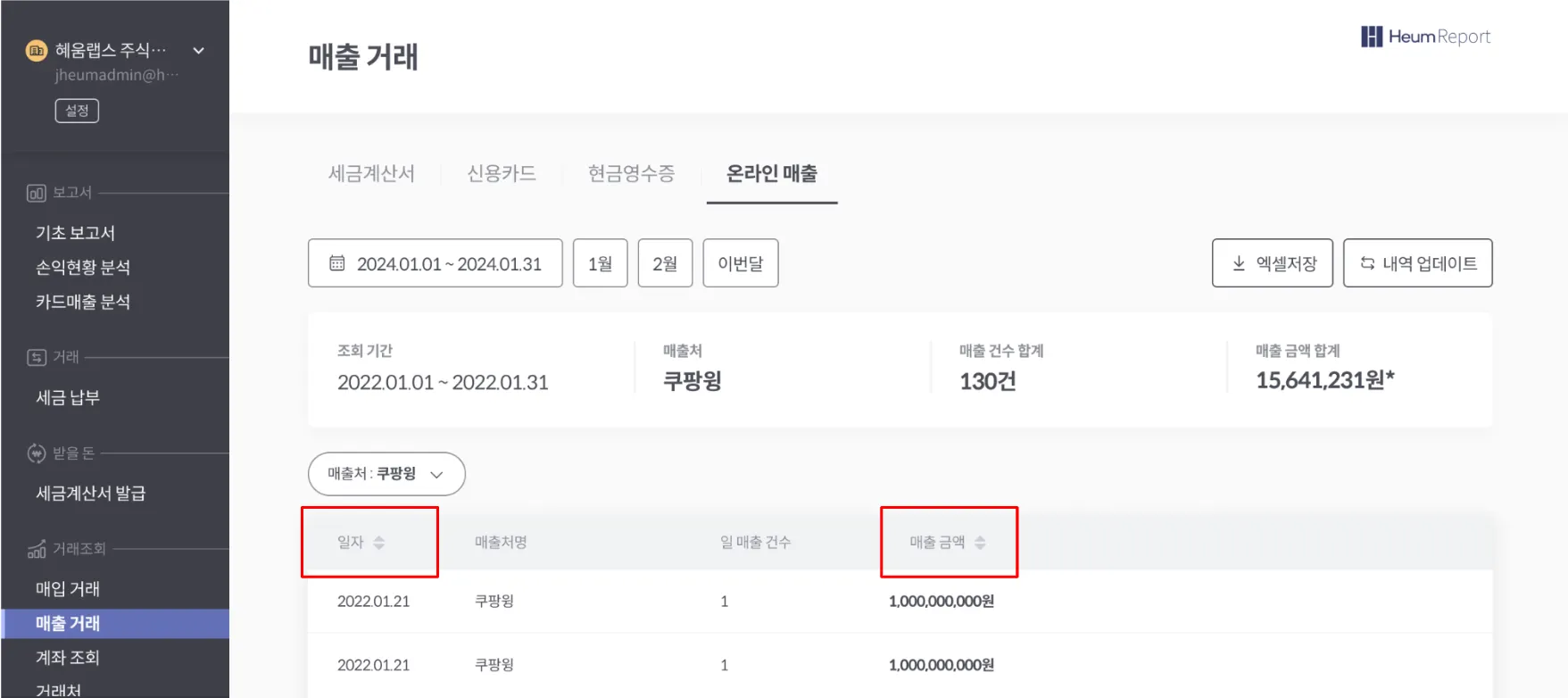 6. 일자, 매출 금액을 오름차순 또는 내림차순으로 설정 가능해요.